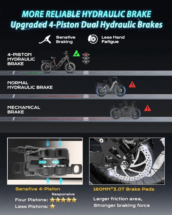 [⚙️𝐔𝐩𝐠𝐫𝐚𝐝𝐞𝐝 𝐇𝐲𝐝𝐫𝐚𝐮𝐥𝐢𝐜 𝐁𝐫𝐚𝐤𝐞𝐬] All-new upgraded Superior 4-piston hydraulic disc brakes provide superior stopping power and more modulation for more efficient heat dissipation, allowing you to better control their speed and stopping power. Properly thickened brake disc improves safety and durability, and gives you more control over your ride.