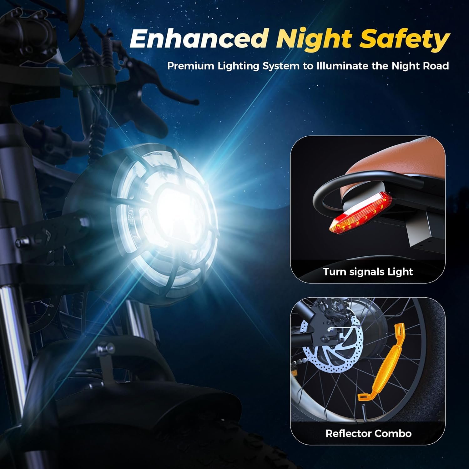 【𝐕𝐢𝐧𝐭𝐚𝐠𝐞 𝐅𝐫𝐚𝐦𝐞 𝐃𝐞𝐬𝐢𝐠𝐧, 𝐒𝐚𝐟𝐞𝐭𝐲 𝐔𝐩𝐠𝐫𝐚𝐝𝐞𝐝】 This electric motorcycle features a classic vintage frame design, blending style with safety. A high-brightness front headlight ensures clear visibility at night, while the integrated rear warning light and turn signals enhance visibility. The front and rear disc brakes, combined with an electric brake system, provide precise and efficient braking, ensuring a safe and stable ride.