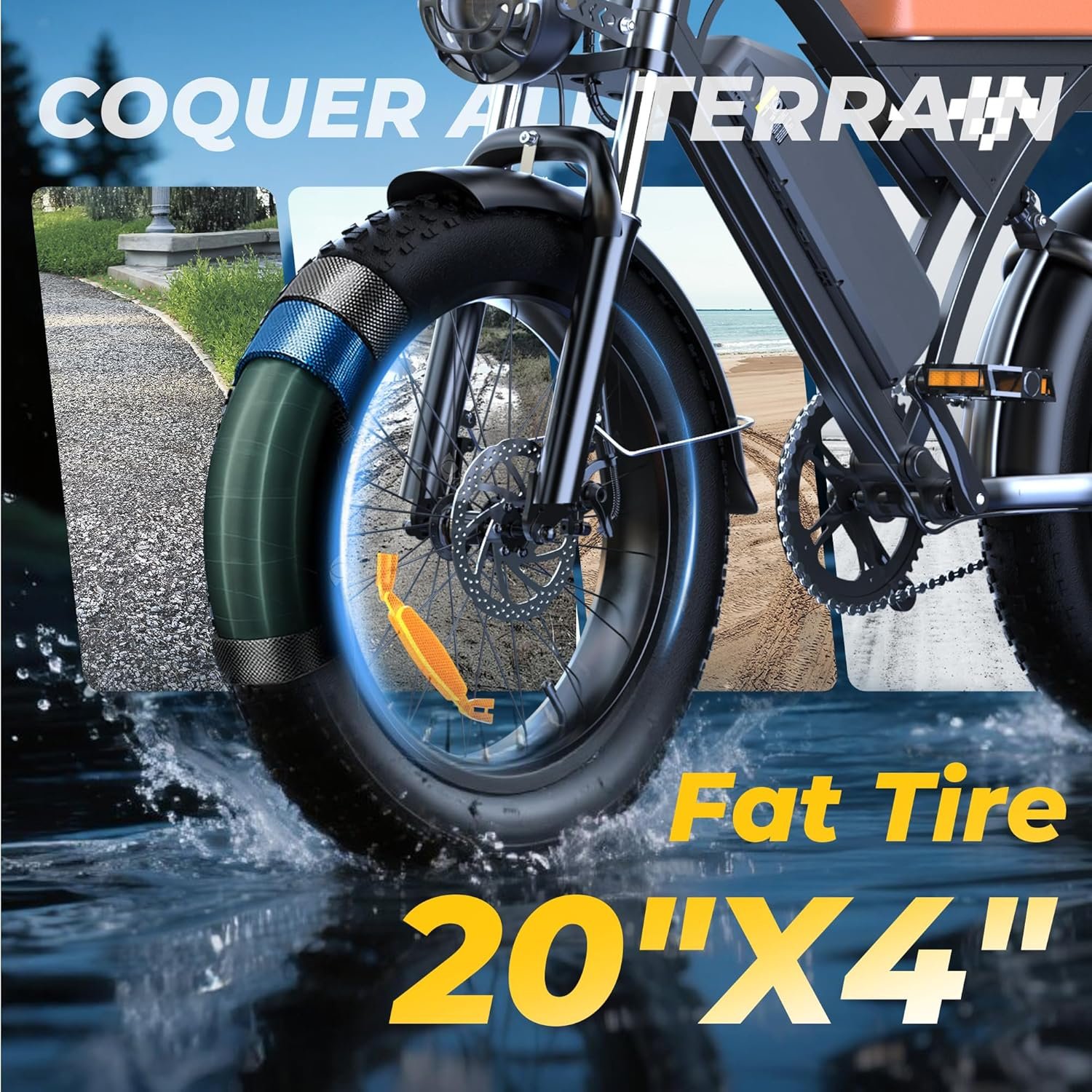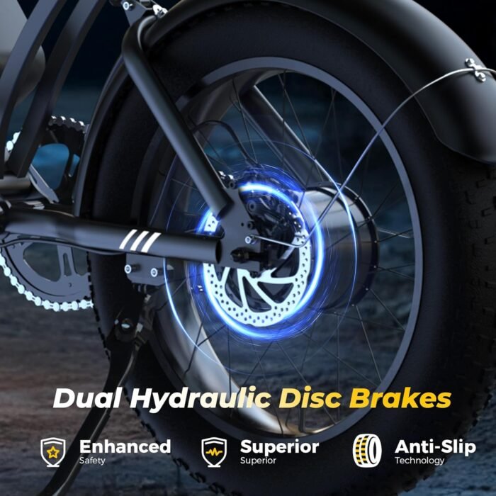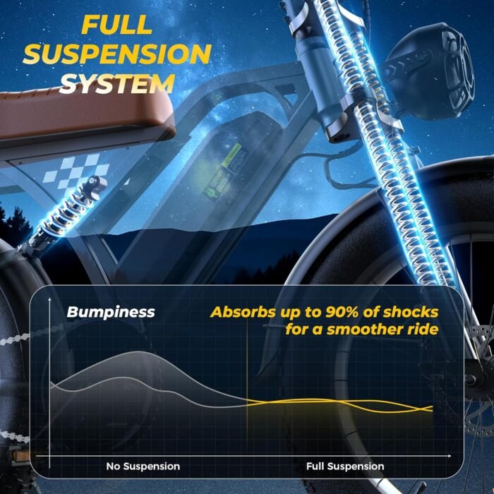 【𝐅𝐮𝐥𝐥 𝐒𝐮𝐬𝐩𝐞𝐧𝐬𝐢𝐨𝐧, 𝟐𝟎”×𝟒” 𝐅𝐚𝐭 𝐓𝐢𝐫𝐞】 This Fat Tire ebikes for adults features a top-tier shock absorption system with a hydraulic front fork and a high-performance rear coil spring. The 20”×4” puncture-resistant tires ensure a smooth, stable ride on city streets and rugged trails. Designed for comfort, the ergonomic, waterproof seat with high-density foam reduces fatigue, making this electric bike for adults perfect for long rides and ultimate enjoyment.