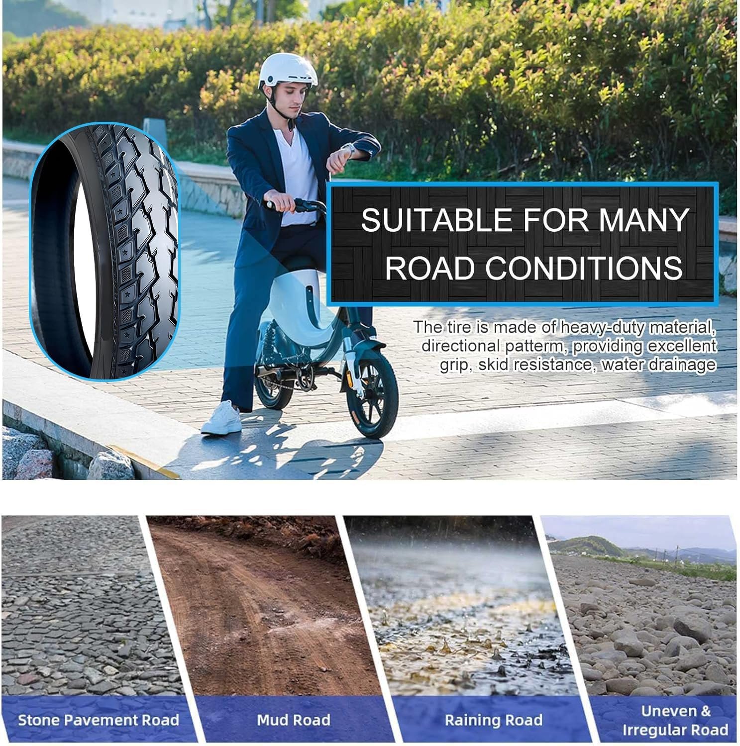 Symmetrical tread design tire for 14×2.125(57-254) electric folding bike front or rear wheels. Only applicable to e-bikes and e-scooters. Not suitable for bicycles