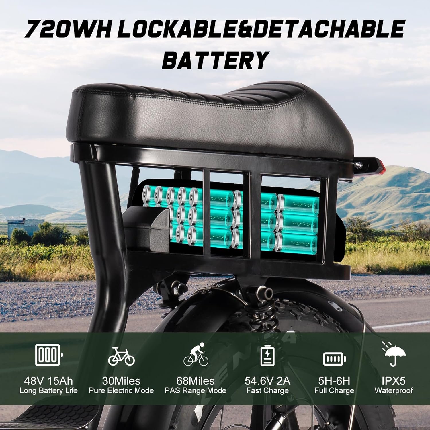 ✔️Lasting Battery Power-The UL-certified 720WH IPX6 waterproof lithium-ion battery not only possesses outstanding waterproof performance but also exceptionally safe and reliable. With 7 hours full charge, it achieves a range of up to 50 miles with pedals, and the removable battery design ensures convenient charging whether you are at home or in the office.