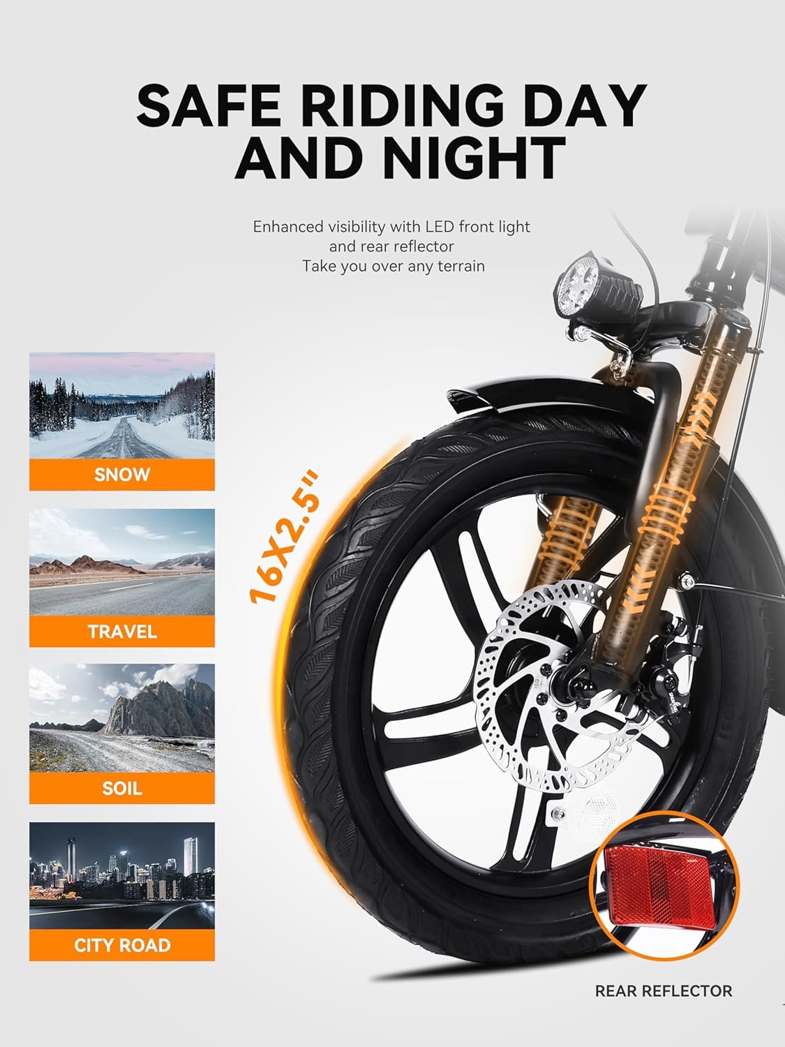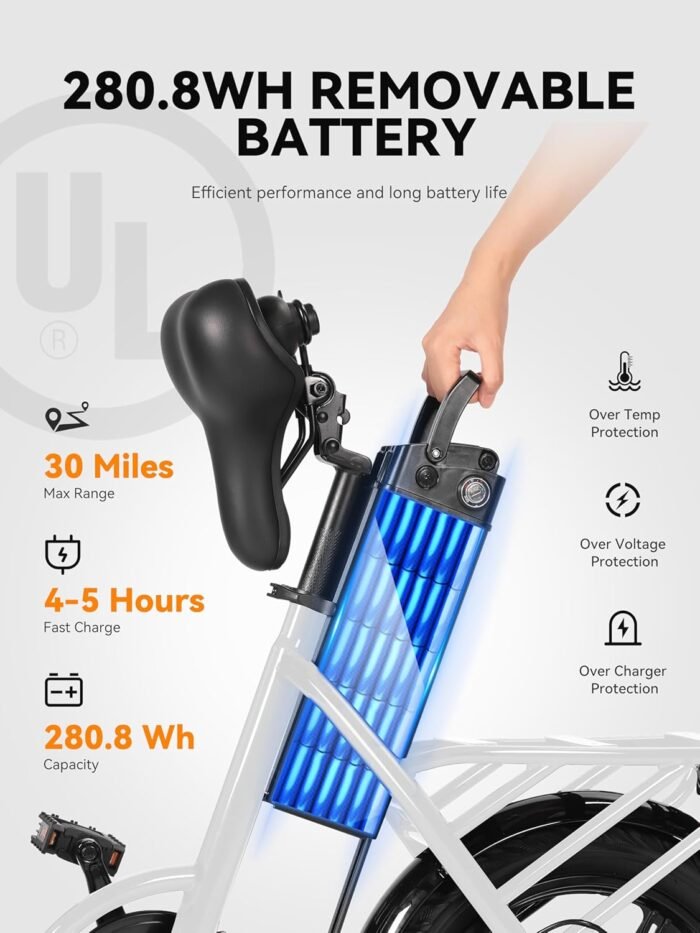 Mini E-Bike with Astonishing Power: Powered by a removable 36V 280.8Wh UL2849 certification battery and 16″X2.5″ tires, this e-bike offers an impressive range of up to 30 miles and recharges in just 4-5 hours