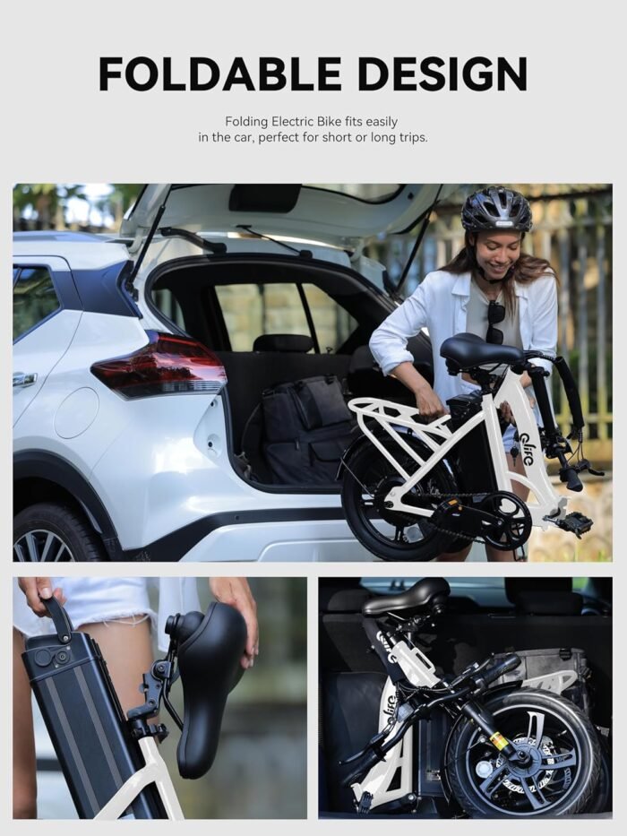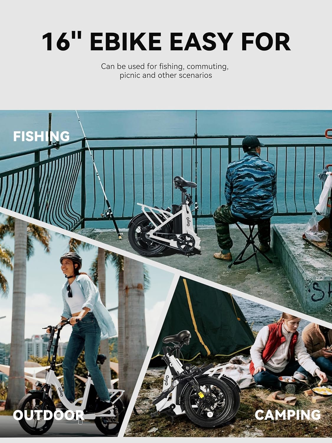 Foldable and Adjustable Design Ebike: This compact e-bike features a foldable design (folded dimensions: 29.1 x 27.9 inches) for easy storage in apartments, offices, or car trunks. Its low-frame design accommodates riders aged 16 and older, while the adjustable seat height ensures a comfortable fit for everyone. Perfectly packaged for personal use or as a gift