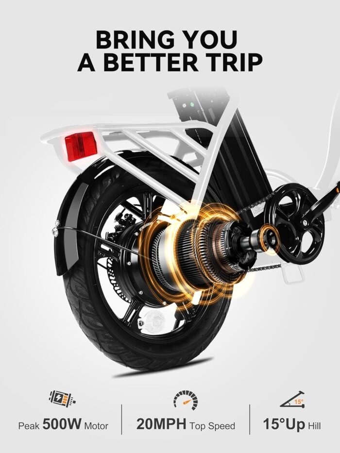 PEAK500W Powerful Motor: Experience robust motor with peak power reaching 500W, delivering speeds up to 20mph. Choose from three riding modes—manual, pedal assist, and pure electric—making it perfect for daily commutes