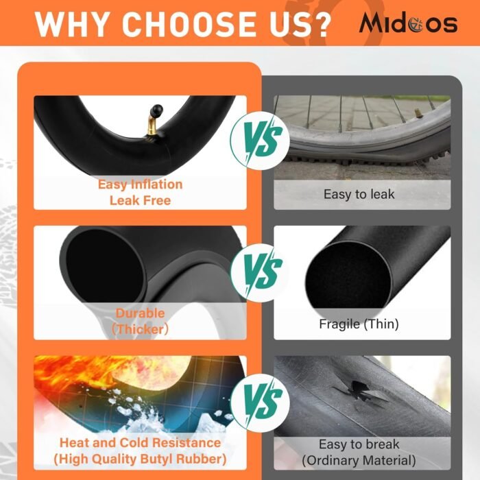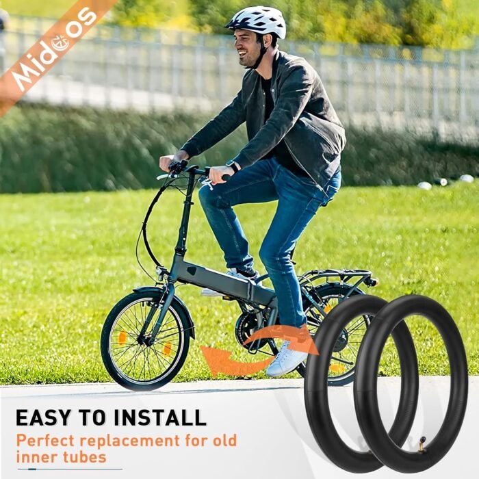【High Air Tightness】The 14 x2.125 electric bicycle tube of the bike is made of high quality butyl rubber compound, which is 8 times more airtight than natural rubber. The seal uses a with CR202 Angled Valve Stem with a valve core cap. The black lever valve cover will create a unique airtight environment, preventing the inner tube from losing air and providing safety for riding.