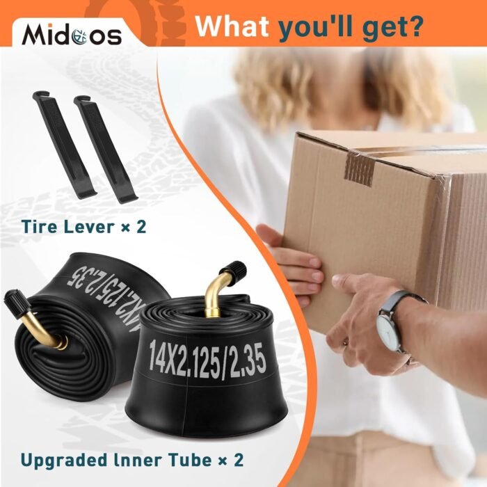 【Come with Tire Levers】Our 14 x 2.125 fat bike tire tube kit includes two tire levers for removing and installing the bike tubes on your bike. The bike tube can be easily removed from the tire with the help of the tire levers, making tire maintenance a breeze for riders of all skill levels. When replacing a bicycle inner tube, be sure to add a small amount of air before mounting. This will shape it so that it will not twist or curl and cause a pinch flat.