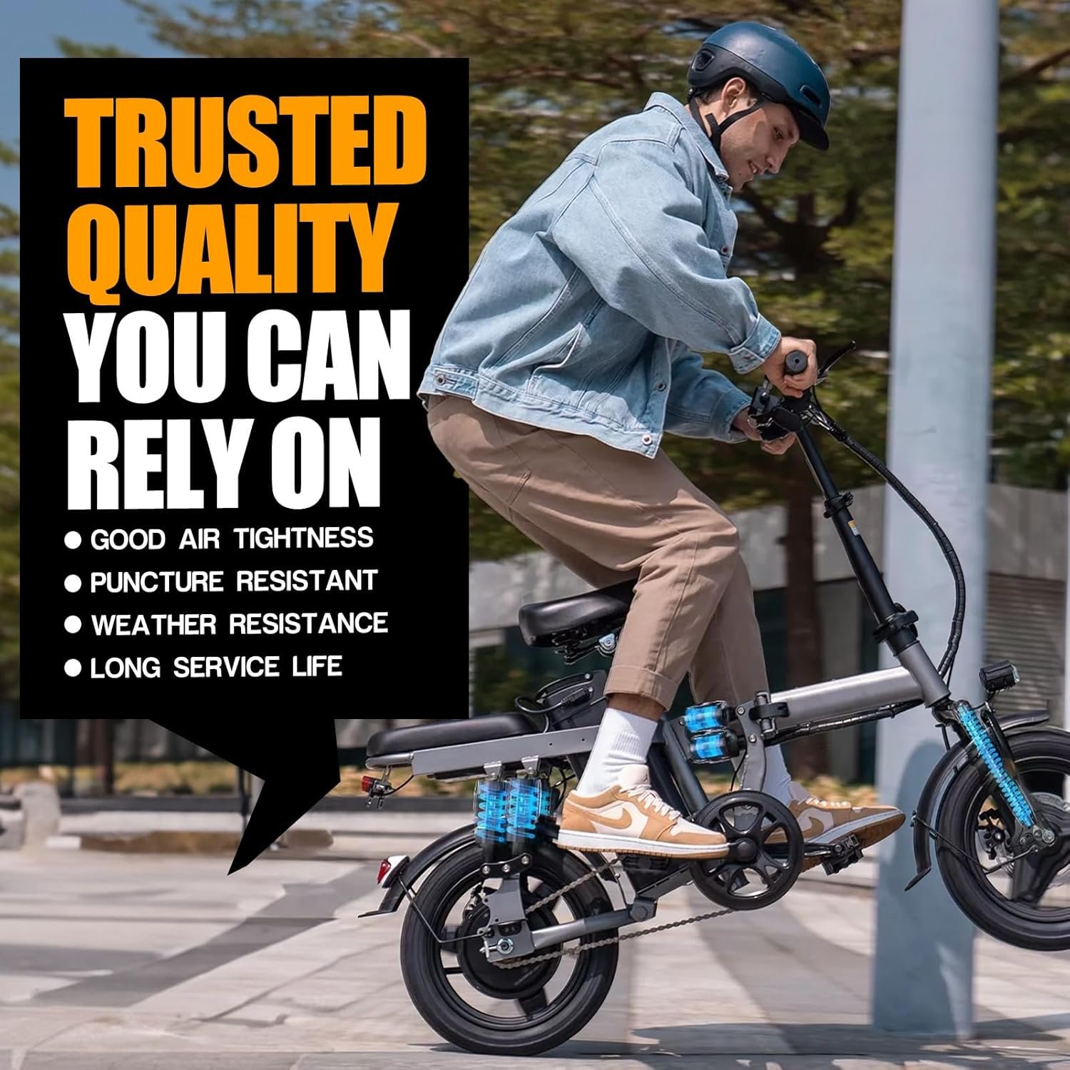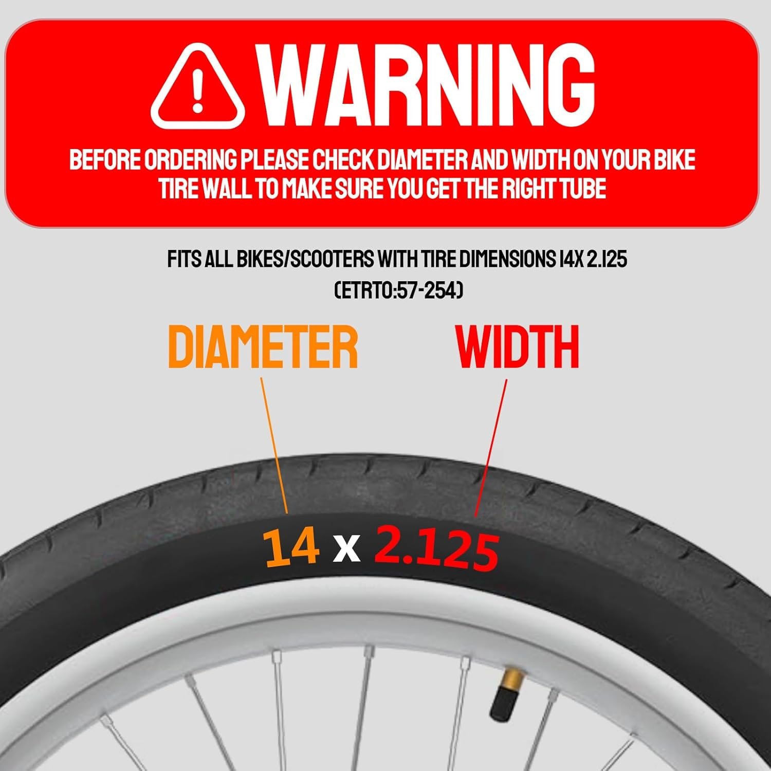 【Bicycle Tube Size】14×2.125 (57-254) Inner tubes, designed for most 14 inch electric bicycles and scooters, angled valve stem simplifies inflation while sealing securely. 100% butyl rubber construction ensures long-lasting durability.