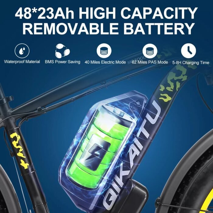 Large-capacity battery: 48V23AH waterproof and removable lithium-ion battery, you can ride 40-60 miles at a time with the support of pedals. It only takes 6-8 hours to fully charge. The detachable design allows you to charge anytime and anywhere, and you don’t have to worry about your journey anymore.