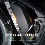Battery Assist to Defeat Fatigue: The 26″ fat tire electric bike is equipped with a detachable 52V 22.4Ah battery, offering a range of 35-50 miles with pedal assist and 40-60 miles on pure electric power. Say goodbye to the worry of running out of energy during your adventures. The battery fully charges in 8-9 hours, making it the perfect companion for long-distance exploration!
