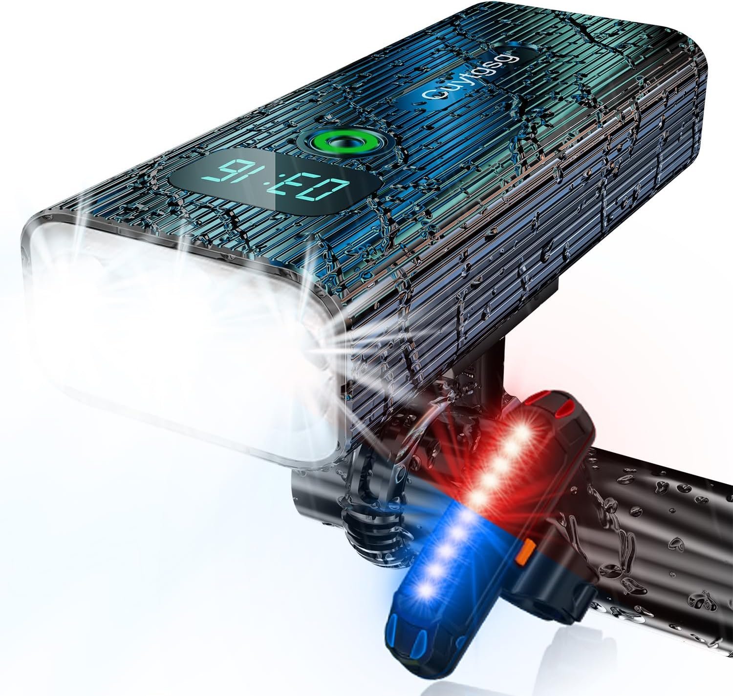 10-MODES BIKE LIGHT RUNTIME UP to 24+Hrs with LCD DISPLAY : Bike Headlight:3/5 Swich Modes,Click Button to Start up: High Light – 18 hr, Medium Light – 22 hr, Low Light – 26 hr, Fast Flash – 30 hr, SOS -36hr Bike Taillight: RED/BLUE 5 Swich Modes : Red ,Blue ,Red Fast Flash ,Red Slow Flash ,Red /Blue Flashing