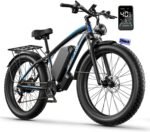 【26″ Fat Tires | Fits Riders 5’7″ – 6’7″】The 26”x4” fat tire ebike features all terrain and weather adaptability, performing well on sand, snow, mountain roads, highways, and other terrains. Fully accessorized with a headlight, horn, mudguards, phone holder with USB charger, intelligent LCD display, metal pedals, adjustable saddle, solid kickstand, and rear cargo rack