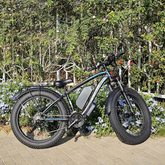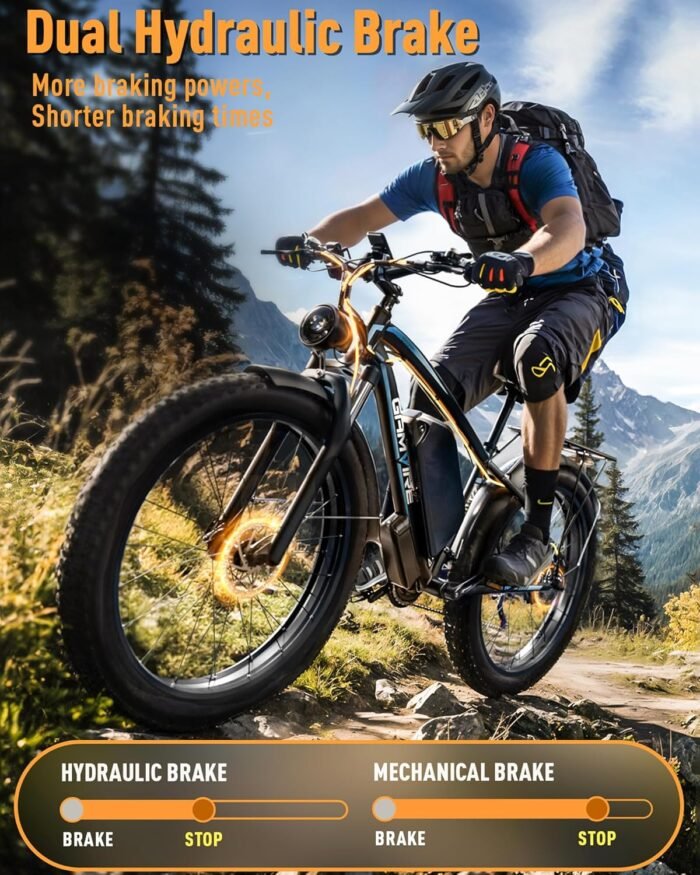 【Dual Hydraulic Disc Brakes & Suspension Fork】Safety meets performance with front and rear hydraulic disc brakes, ensuring instant stopping power on any terrain. The lockable adjustable suspension fork absorbs shocks, reducing fatigue on rough trails, sand, or snow. Combined with 24″ x 4.0″ all-terrain fat tires, this electric mountain bike guarantees superior traction and stable off-road riding.