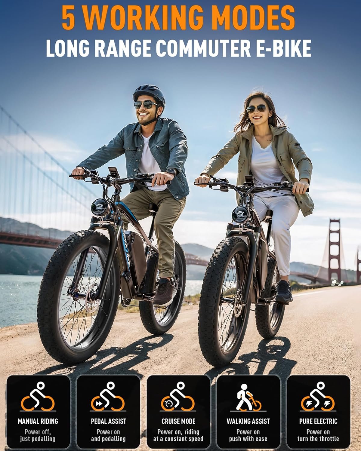 【5 Riding Modes & 21-Speed Gearing】Switch between 5 modes: Pure Electric, Pedal Assist (5 levels), Cruise Control, Walk Mode, and Manual. The PAS system offers adjustable speeds (8/15/20/30/40MPH), while the 21-speed Shimano drivetrain provides precision control for fitness riding, trail blazing, or urban commuting.
