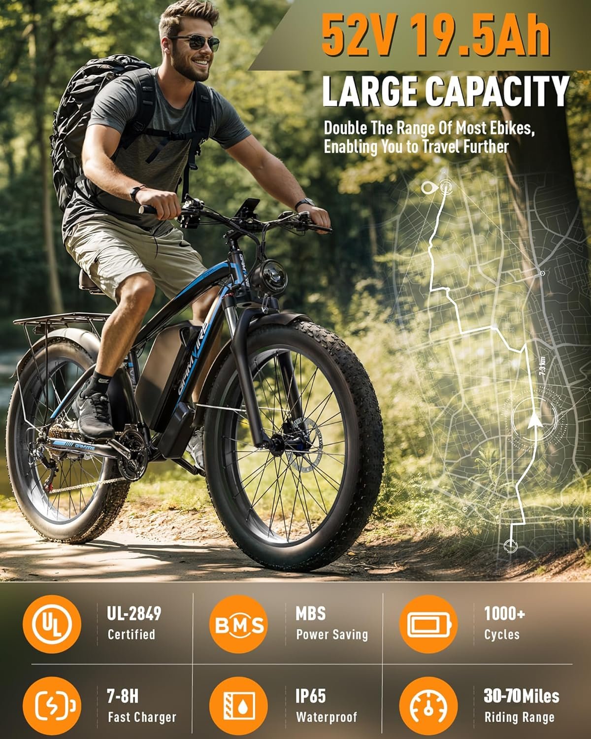 【52V 19.2Ah Battery | Max 70+ Mile Range】Equipped with a removable 52V 19.2Ah (998.4Wh) lithium-ion battery, the V7 fat tire ebike offers an extended range of 70+ miles per charge in PAS mode (30+ miles in full electric mode). The long-life battery (1000+ cycles) supports fast charging (8 hours) and is ideal for daily commutes, weekend adventures, or off-grid exploration.