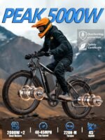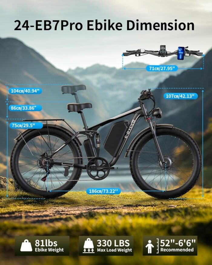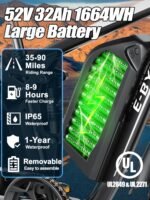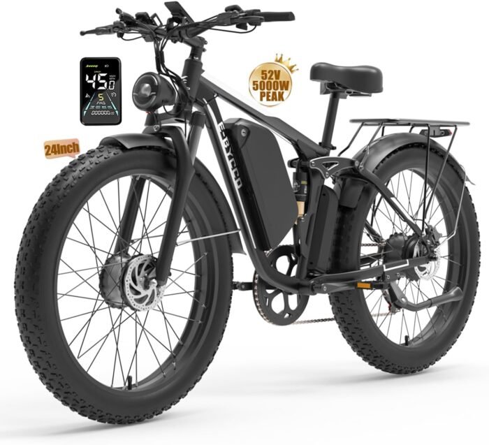 【Powerful 5000W Peak Dual Motor】EBycco 24″ EB7Pro electric bike for adults is powered by 2 high-performance 2500W peak motors, which together provide an amazing 5000W peak power, as well as a high torque of 220N·M, taking you to tackle all terrain and climb 45° uphill easily. It can reach up to 45MPH without load, and can basically reach 40MPH when responsible for 200LBS, which is an ideal choice for thrill seekers and daily commuters.