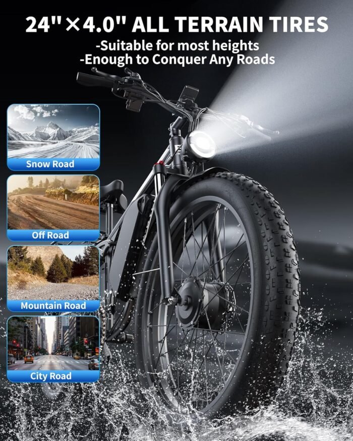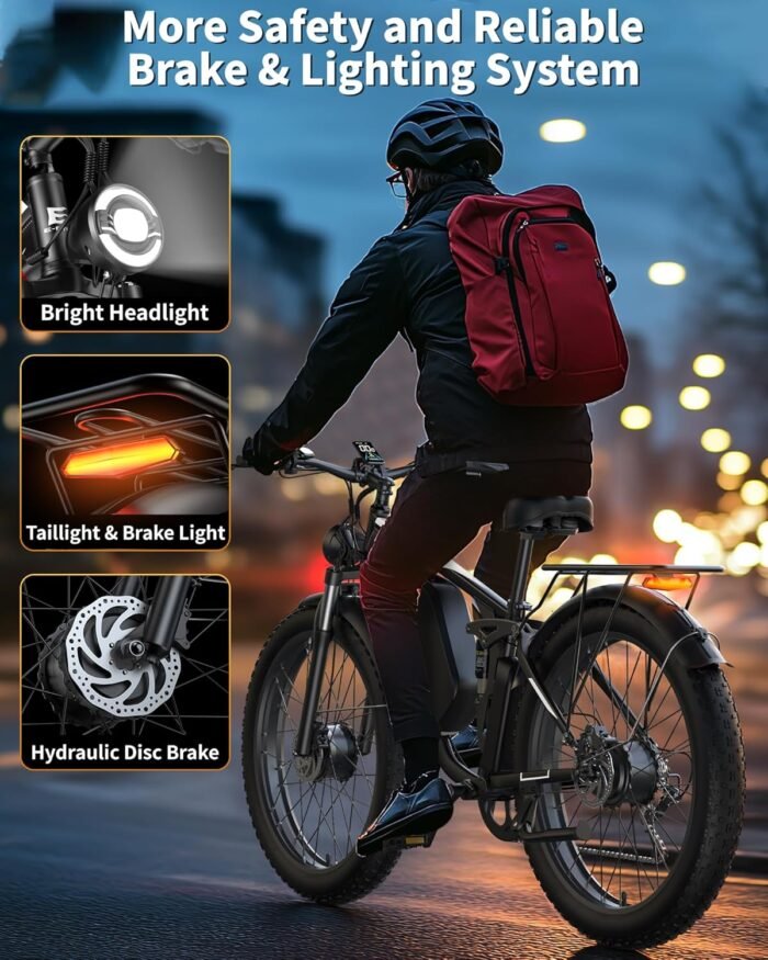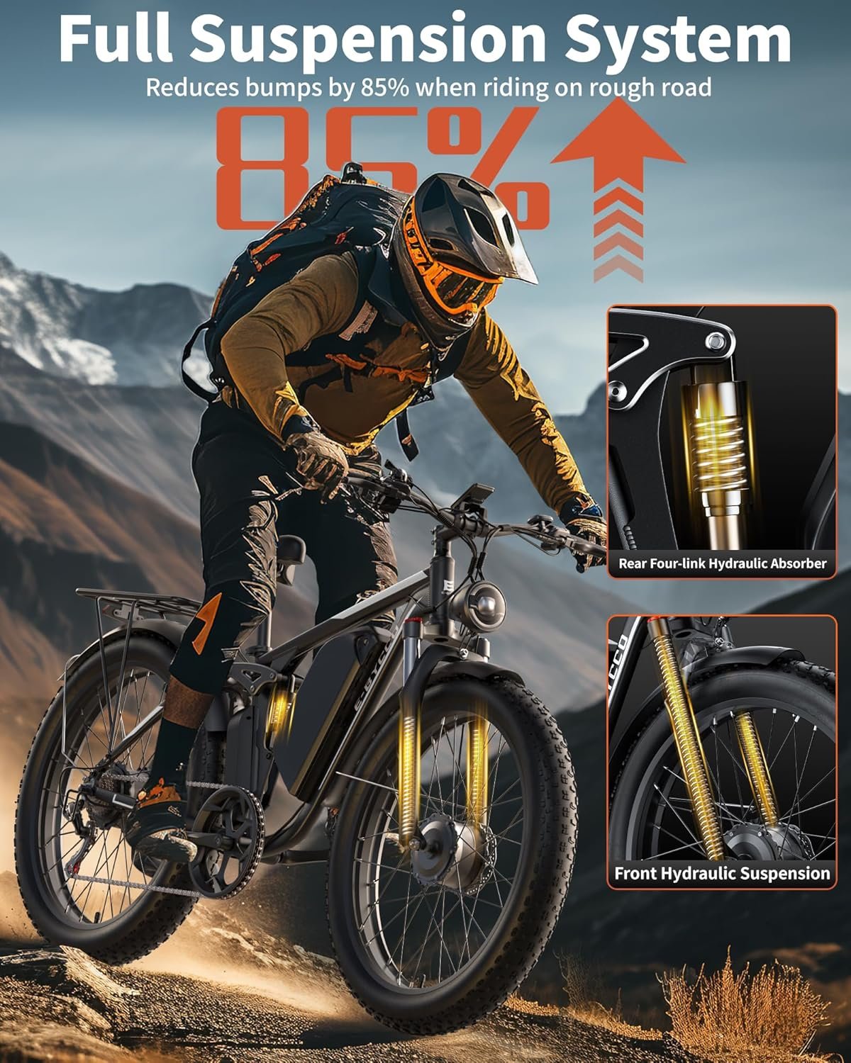 【Professional Full Suspension & 24 Inch Fat Tire】Unlike most shock absorbers on the market, EBycco dual motor ebike adopts lockable and adjustable front fork shock absorber and rear hydraulic shock absorber, which greatly improves the shock absorption coefficient and reduces the impact and pressure during riding. This 24″ fat tire ebike has excellent grip on all-terrain and is designed for off-road and urban cruising, allowing you to ensure maximum traction and stability in any environment.