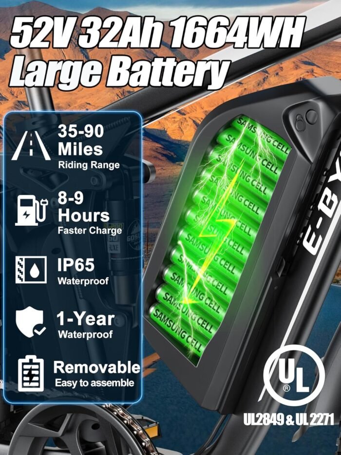 【52V 30AH Samsung Cells Battery】EB7Pro Dual motor electric bike is equipped with an advanced 52V 30AH Samsung Cells lithium-ion battery with a total capacity of 1560WH. It can provide a range of up to 90+ miles in PAS mode and 32+ miles in electric mode. Our electric mountain bikes for adults is equipped with an 8-10 hour fast charging system and provides a meter to display the battery power in real time, allowing you to get on the road quickly, which is perfect for long-distance riding.