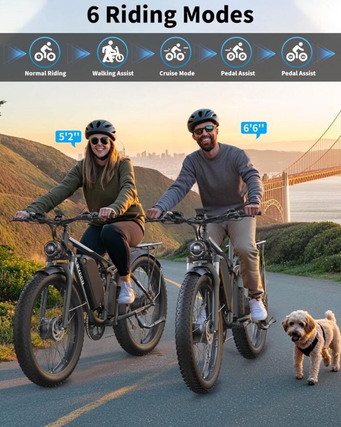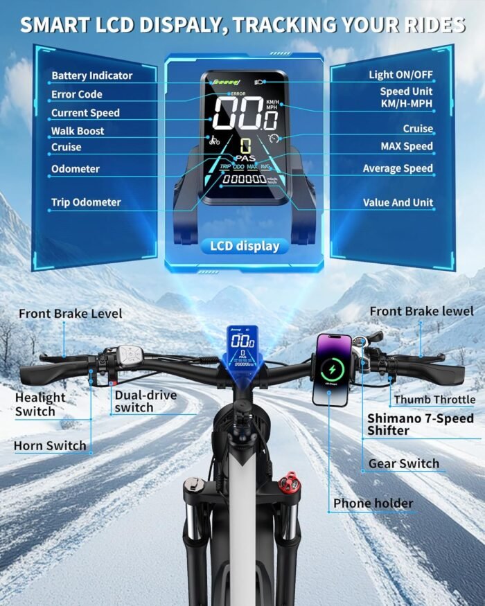 【Versatile 6 Riding Modes】E·Bycco dual motor electric bike for adults offers 6 different riding modes, allowing you to customize your ride according to your preferences and conditions: dual motor pure electric, single motor pure electric, pedal assist (5 levels), walking mode, cruise mode and manual mode. This professional 52V 5000W peak ebike with 7-speed gear shifter allows you to change the gears for adapting to different terrains, enhancing both riding comfort and efficiency.