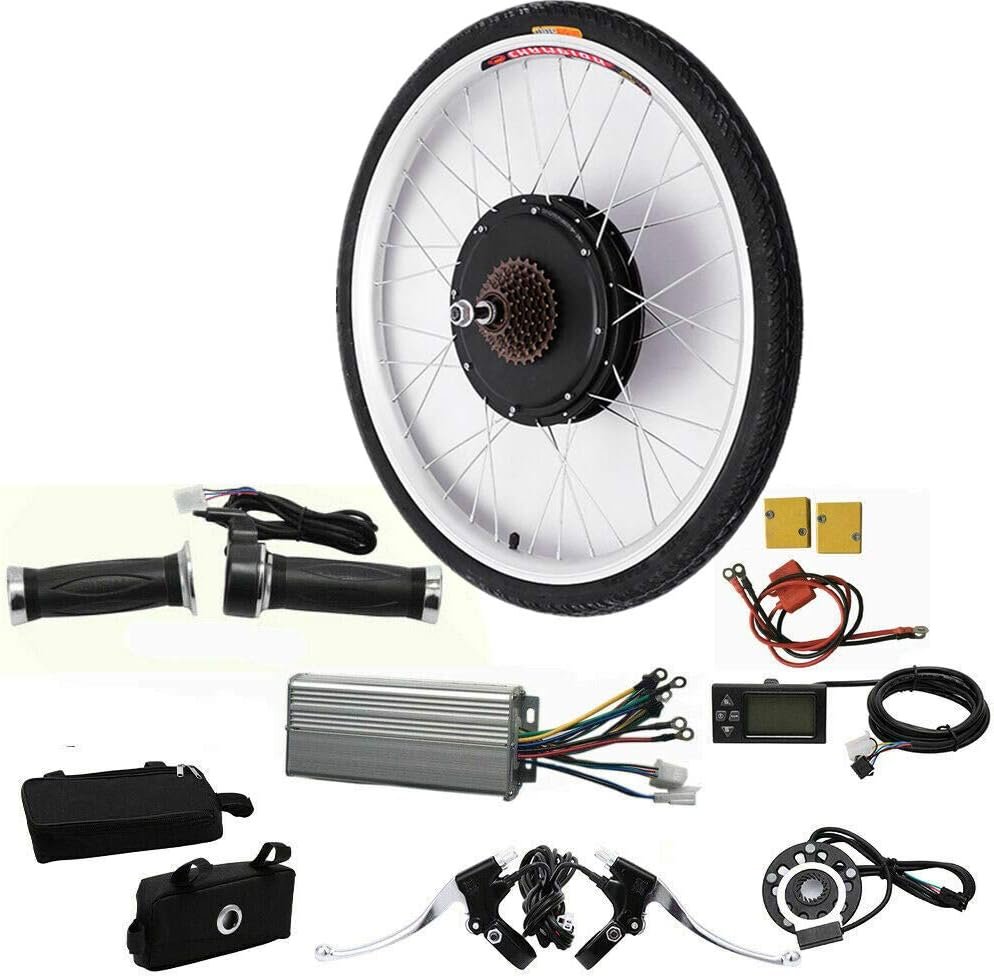 【COMPLETE CONVERSION KIT】Electric Bicycle Ebike Conversion Kit includes all necessary components for installation. Spokes and Aluminum Circle, 48V 1000W Controller, Controller Bag, PAS, Twist Throttle with 5 Star, Brake Handle, Connectors and Fuse, LCD (about Speed and Power), Harness Wires. (Battery is not included)