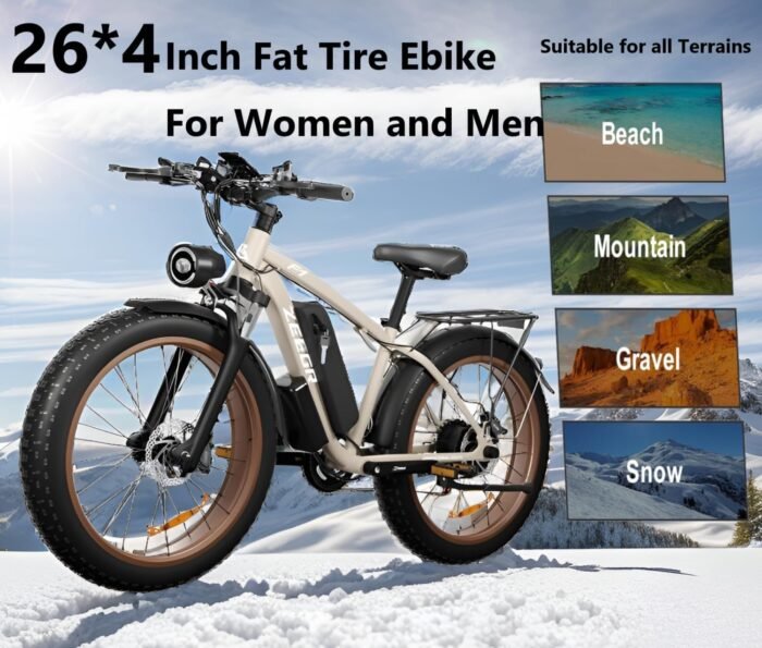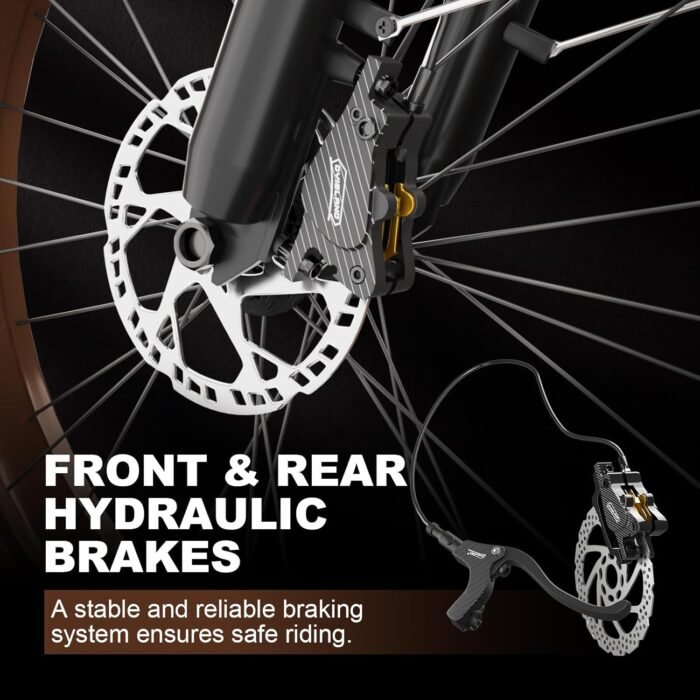 【26″ All-Terrain Tires】The 26″ adult e-bike is made of 26″*4.0″ thick tires, which ensures excellent stability and comfort on a variety of terrains, such as snow, sand, and gravel roads. combined with front and rear hydraulic oil brakes, you can enjoy sensitive and powerful braking even on steep slopes, rough terrain or other extreme terrain. make your adventurous explorations a free and carefree experience.