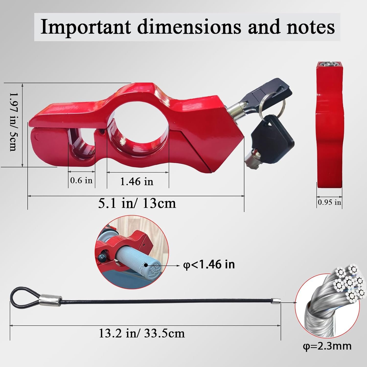 【Wide Application】The motorcycle security locks fit motorcycles, sport bikes, scooters, mopeds and ATVs with handlebar diameters up to 1.46 inches, and are compatible with popular brands such as Yamaha, Kawasaki, BMW, Ducati, Suzuki, Triumph and more, with a rubber gasket to fill the gap.