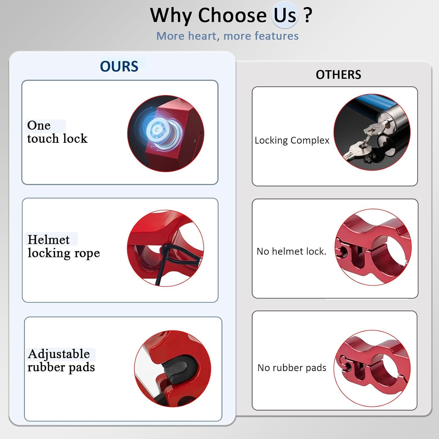 Our motorcycle lock is a multi-functional 2-in-1 lock that can be used as both a handlebar lock and a helmet lock. This motorcycle helmet lock prevents thieves from stealing your vehicle and helmet.