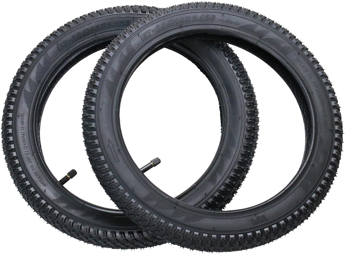 ✨【Best choice】High quality 14X2.125 tires can easily withstand any road test. You can easily and safely ride on gravel roads, oil roads, muddy roads, snow roads, and grasslands, making it perfect for difficult cycling on different types of surfaces.