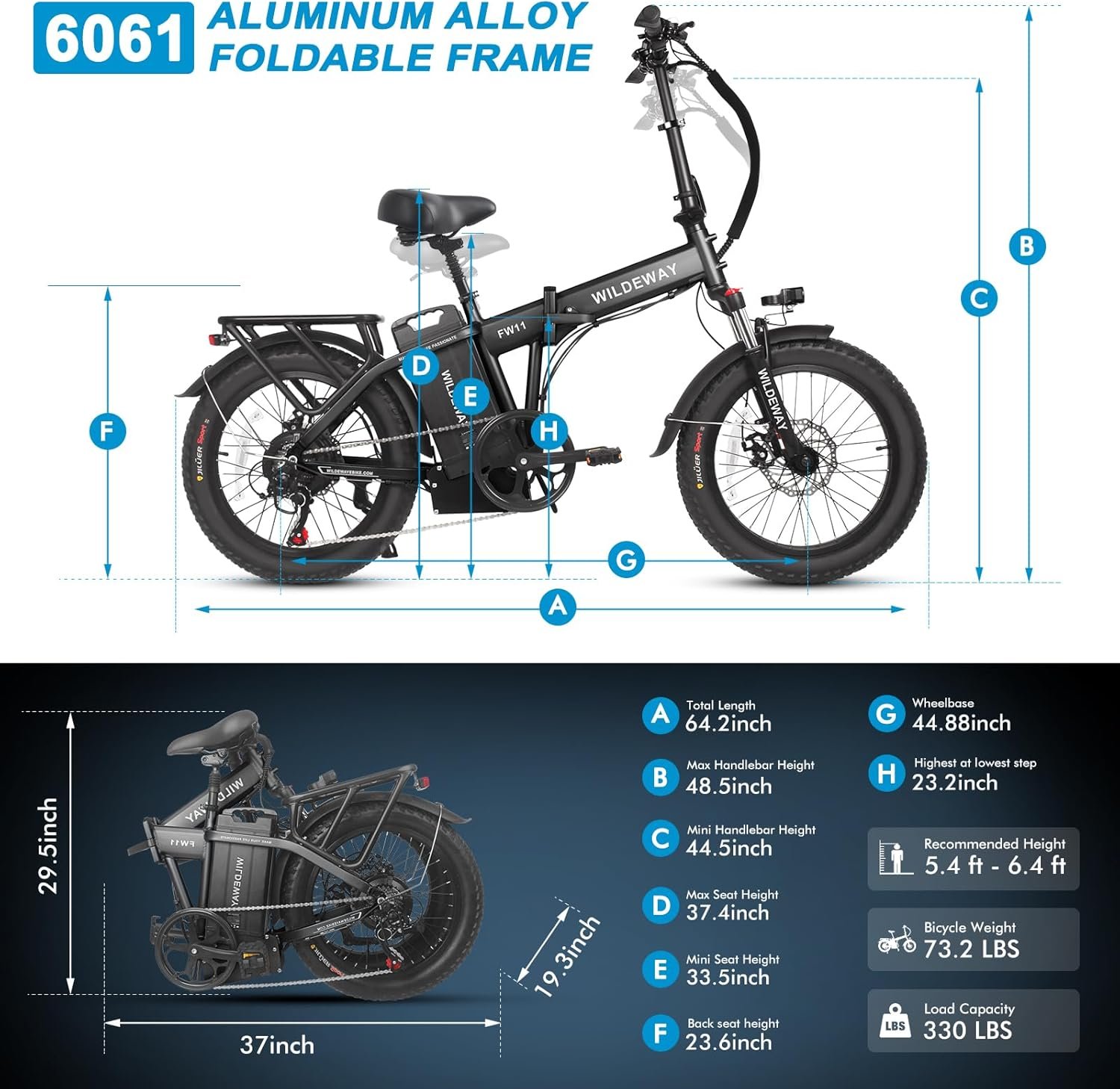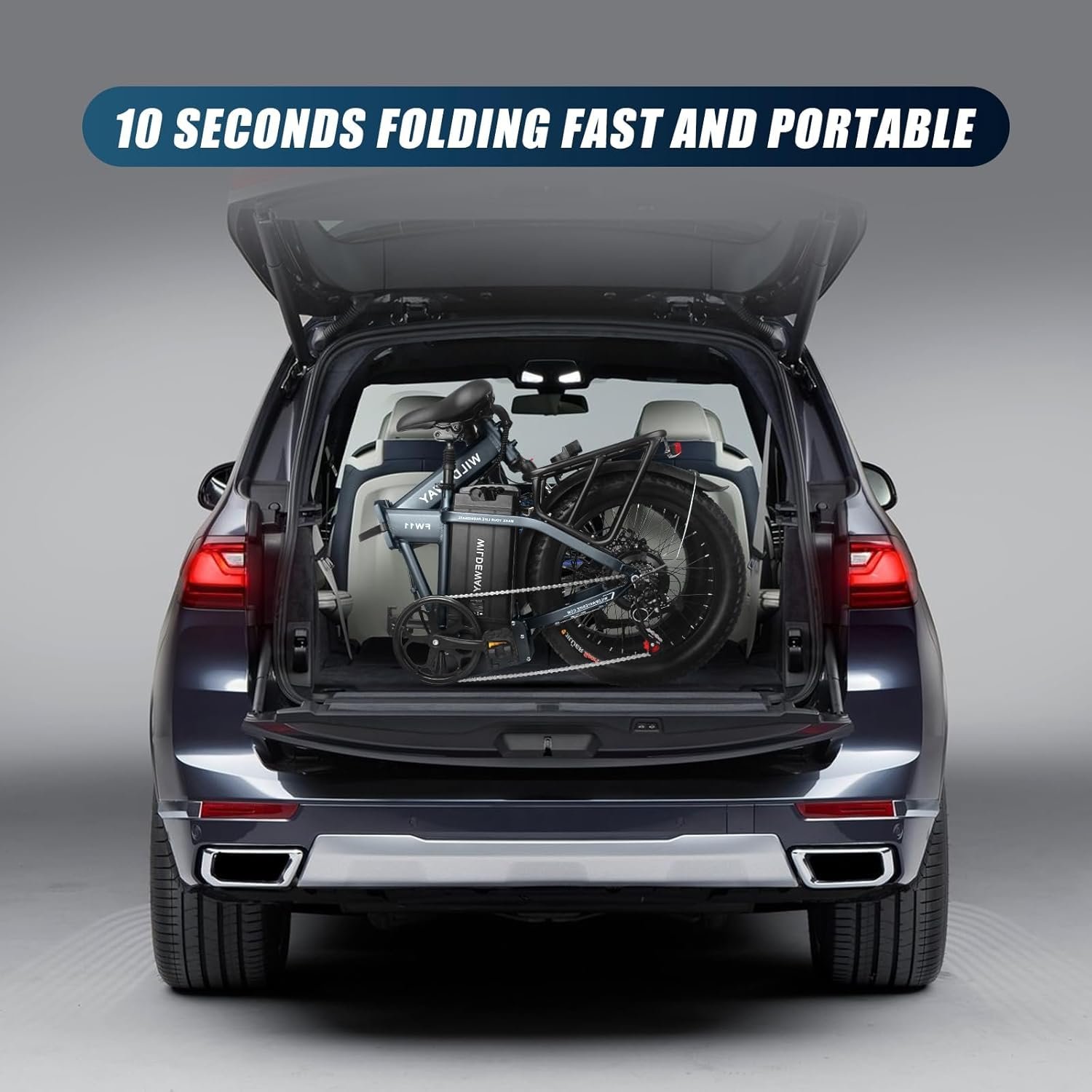 【Foldable and Portable】The FW11 folding electric bike with a folded size of 29.5*19.3*37 inch, weight only 73.2 lbs, the e-bike can be easily folded and stored into the trunk of a car or bring it into subway