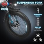 【Front Suspension Fork Combined with 3.0 Off-road Tires】The solid aluminum frame is equipped with a front suspension fork and saddle shock suspension system, with a sensitive response and can be smoothly handled, even if the road bumps can be smoothly through. Combined with 20” x 3.0” Fat Tires, all-terrain tires can be unobstructed on mountain, mud, snow and beaches