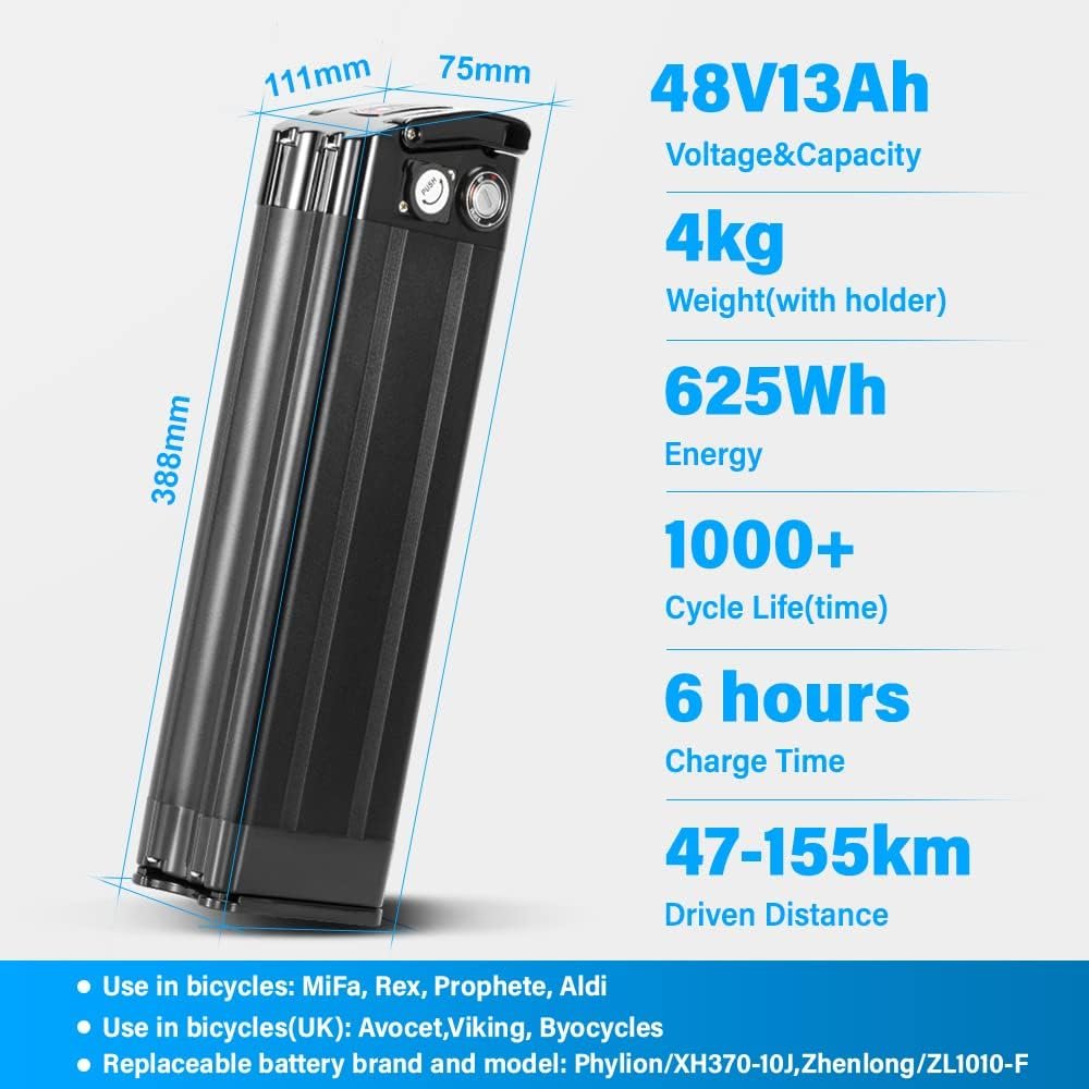 Matching Ebike Style:MiFa, Rex, Prophete, Aldi,Avocet,Viking, Byocycles;Ok for battery Phylion/XH370-10J,Zhenlong/ZL1010-F replacement;This style can’t be replaced for Hey Bike