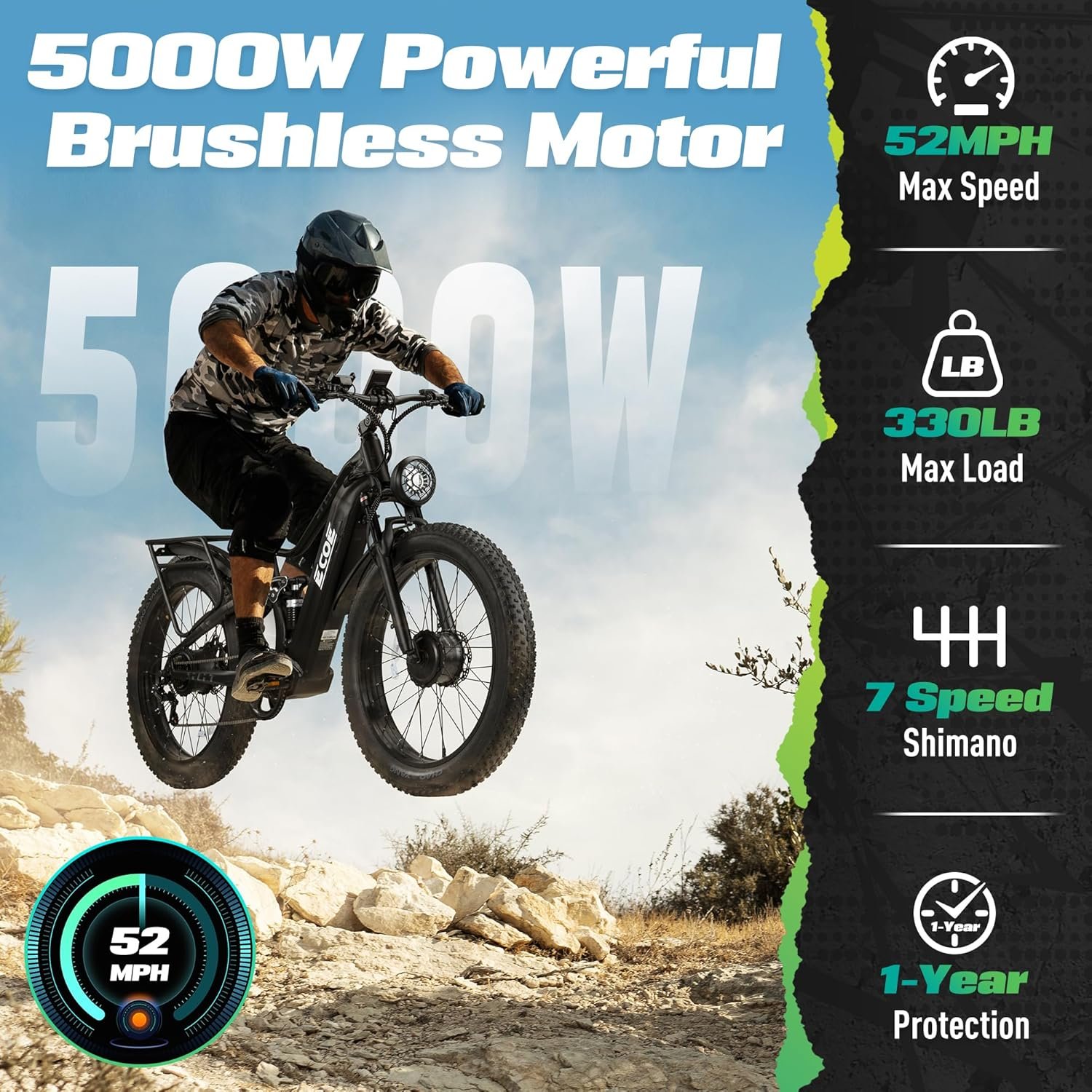 Powerful Motor:EcoE is equipped with a 60V 5000W high-speed brushless motor, and the idle speed can easily reach 55MPH. Due to different loads and road conditions, the actual speed varies between 45-52MPH. The electric bike drive system provides adjustable assistance, allowing you to stay healthy, relax, and exercise.