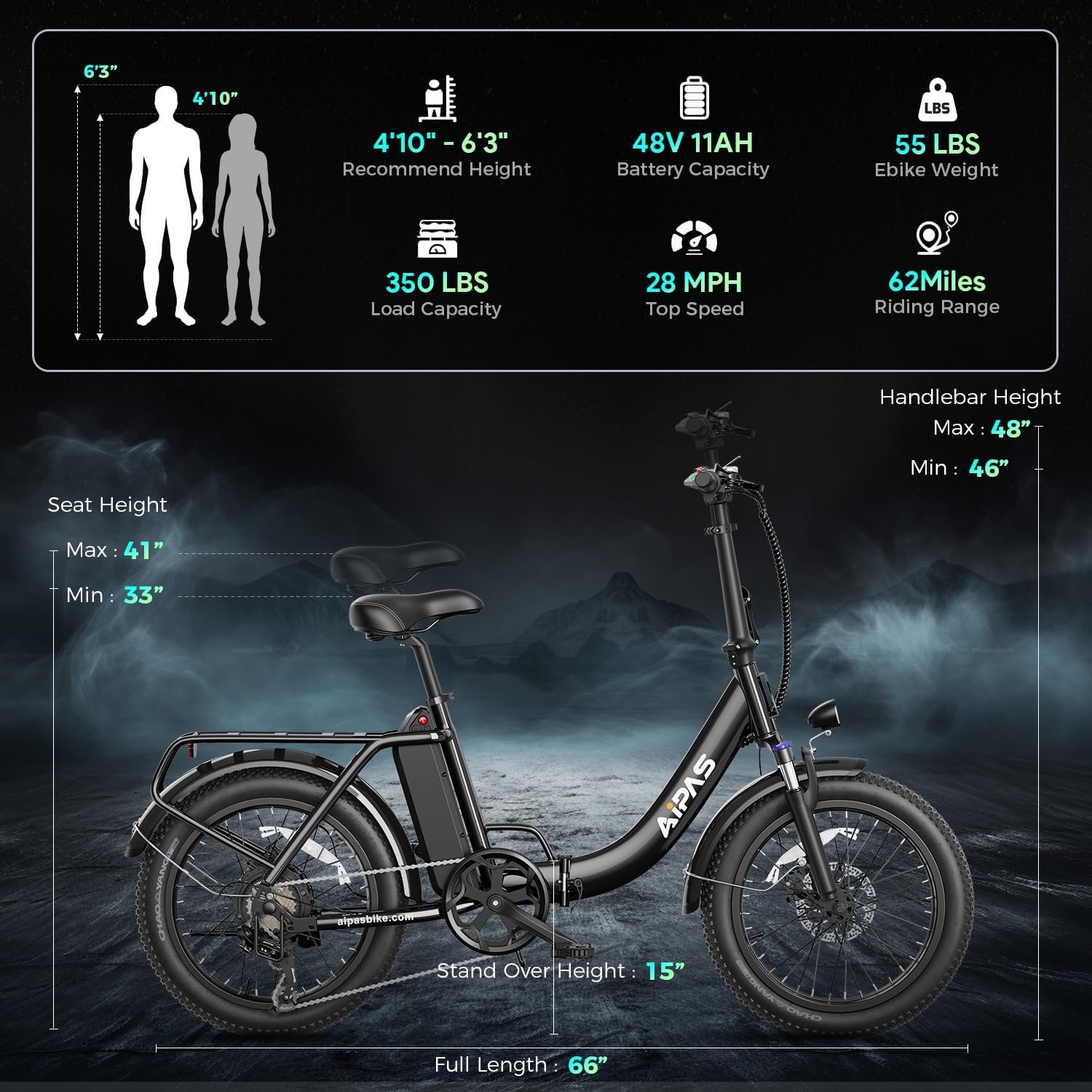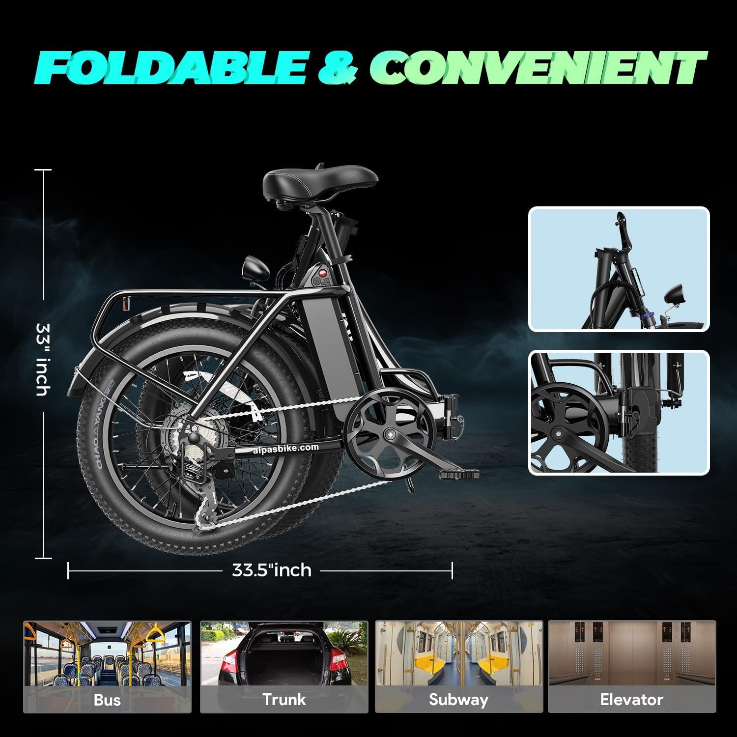 👍Step-Thru & Folding Design : A4 is equipped with a Step-Thru frame ,which is the most favorite of all ages.The foldable design shrinks the space of the ebike, the size of after folding is 40.2*17.6*31.6inches ,you can put the bike into the car when glamping, hiking and riding .