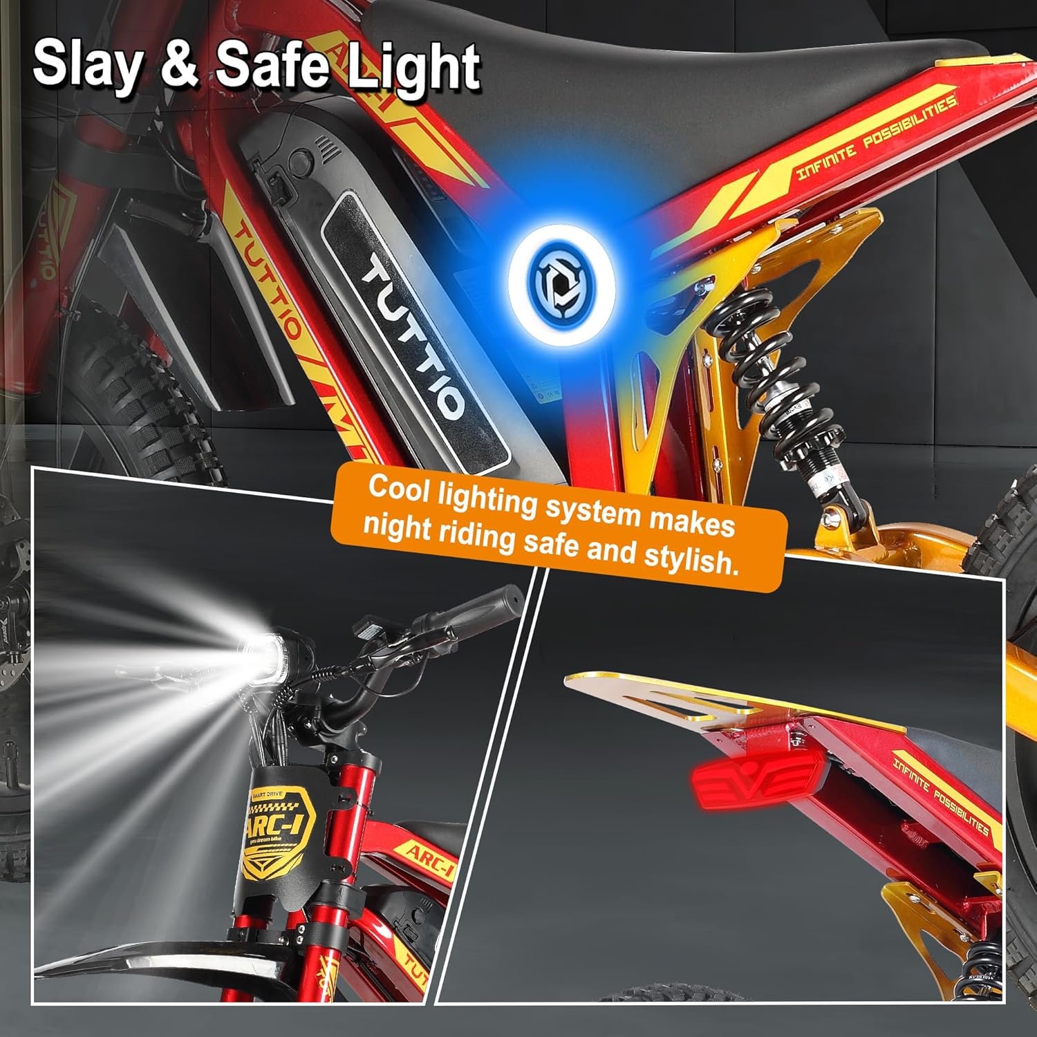 ⚡ Safe & Cool Appearance Design: TUTTIO ARC-I kids dirt bike adopts high-quality spray paint and unique appearance design, making children the most shining rider in the crowd. With eye-catching LED headlights, side ambient lights and bright taillights, making night riding cool and safe, easily igniting children’s passion for exploration and adventure, and is the best dirt bike for every young rider.