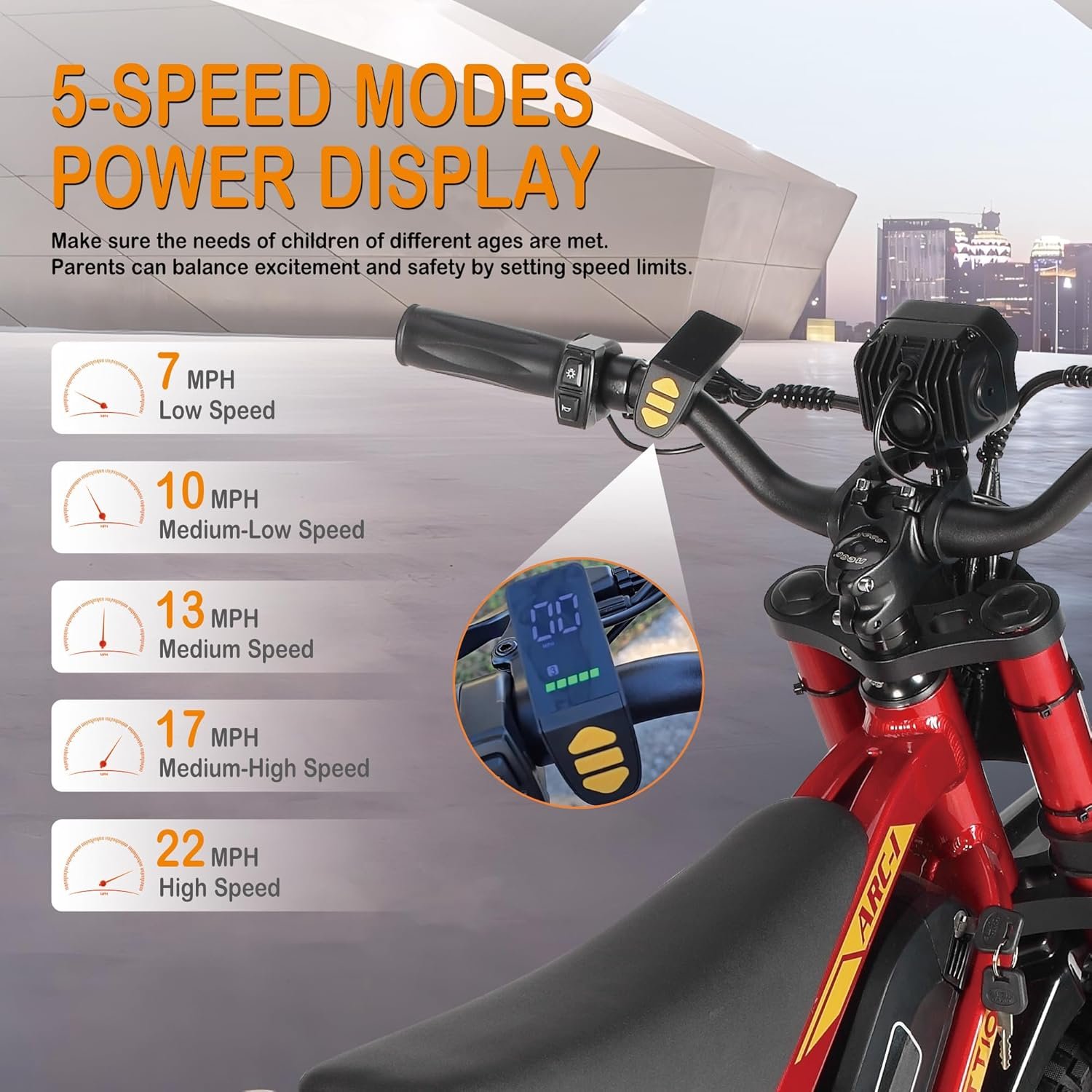 🚀 Safe & Powerful 750W Dirt Bike for Young Rider (Ages 5-8): TUTTIO ARC-I kids electric dirt bike is designed specifically for children’s first e-bike experience, which is equipped with a powerful 750W high-torque motor, and can reach top speed of 22MPH. The child-sized twist grip throttle is ergonomically designed for small hands, and 5 adjustable speed modes (7MPH, 10MPH, 13MPH, 17MPH and 22MPH) allow gradual skill development under parental supervision with safety as the core goal.