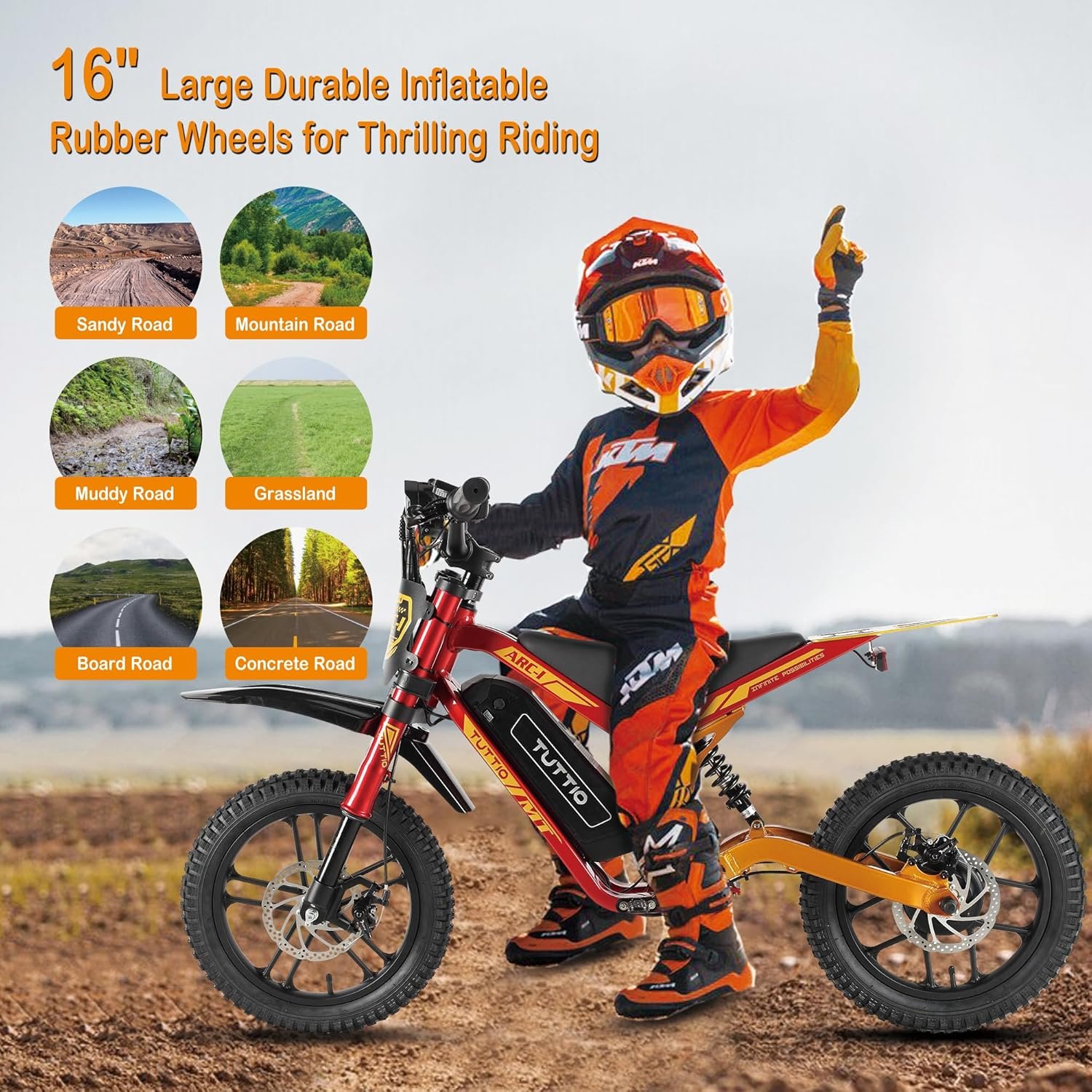 🏍️ Comfortable All-terrain Riding Experience: TUTTIO ARC-I electric motorcycle features 16-inch rubber wheels that provide excellent grip, can be easily controlled whether it is mountain roads, sandy roads or urban roads, meeting the different riding needs of kids! The leather seat surface of this electric dirt bike is crafted from high-density waterproof material, featuring an internal high-density sponge for a soft and comfortable seat cushion.