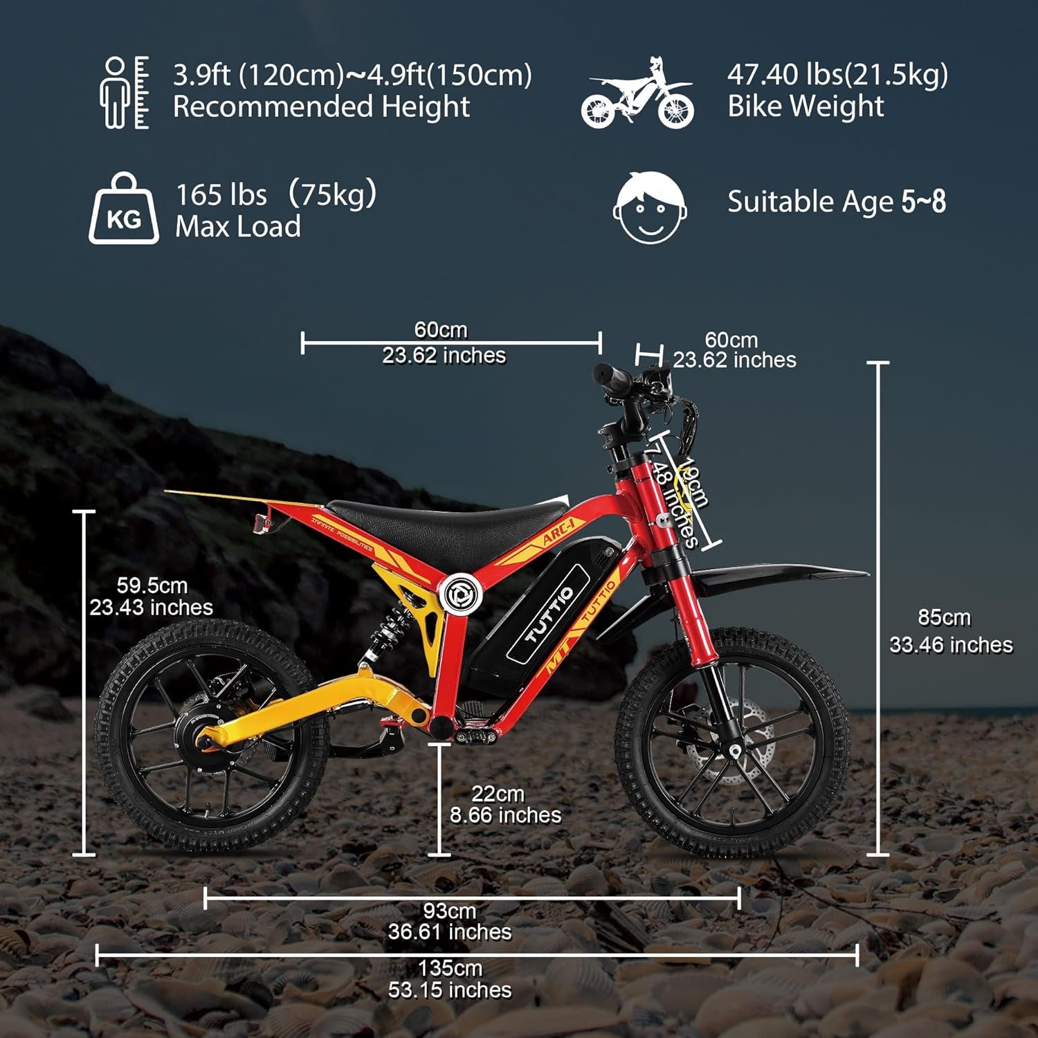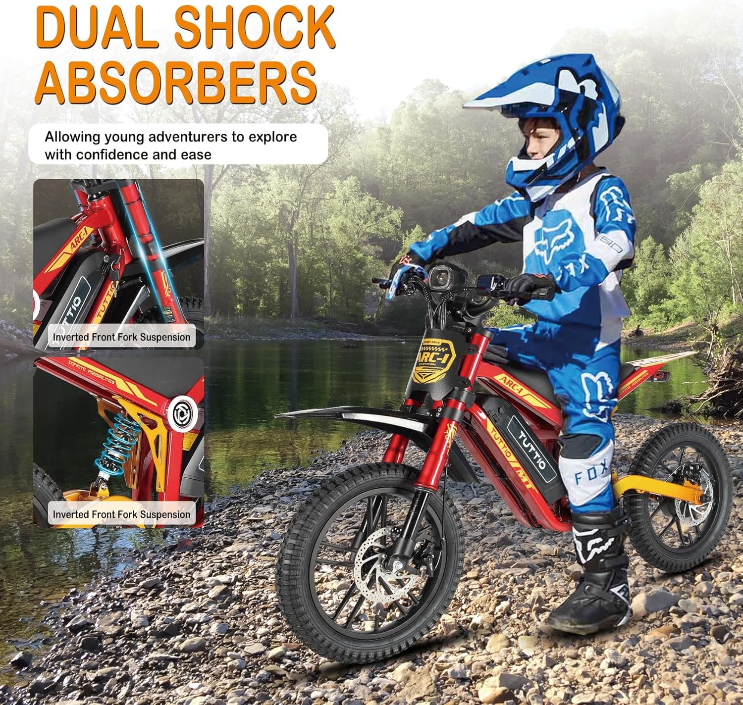 ⚙️ Redefining Kids Dirt Bike: TUTTIO ARC-I kids electric bike features a patented frame design for children (Ages 5-8) with a max load of 165 lbs. Full suspension system combines an inverted front fork shock absorber and a rear spring shock absorber to absorb 90% of bumps. Dual mechanical disc brakes are optimized to minimize the hand strength required for a child to operate the brake lever, ensuring that children can confidently control speed on hills, slippery roads or crowded streets.