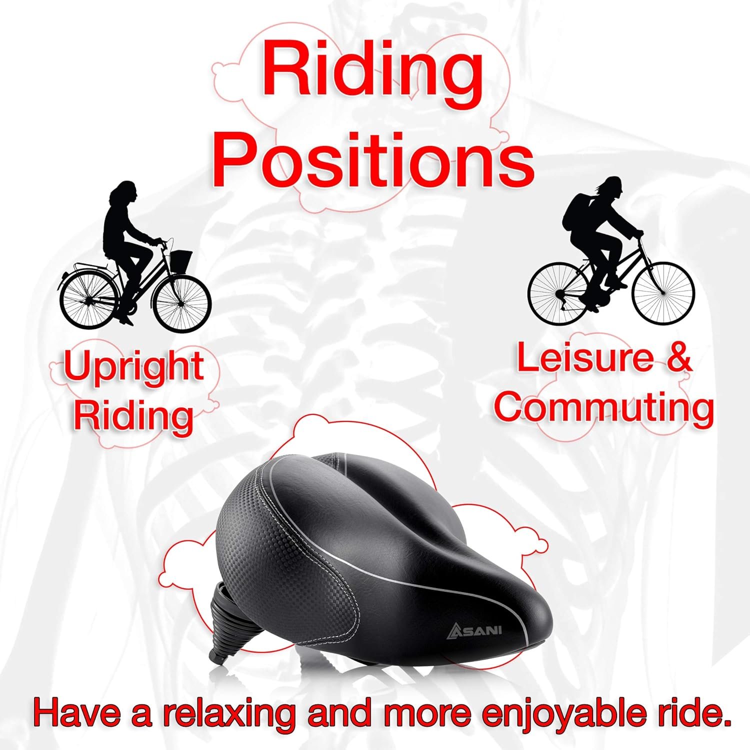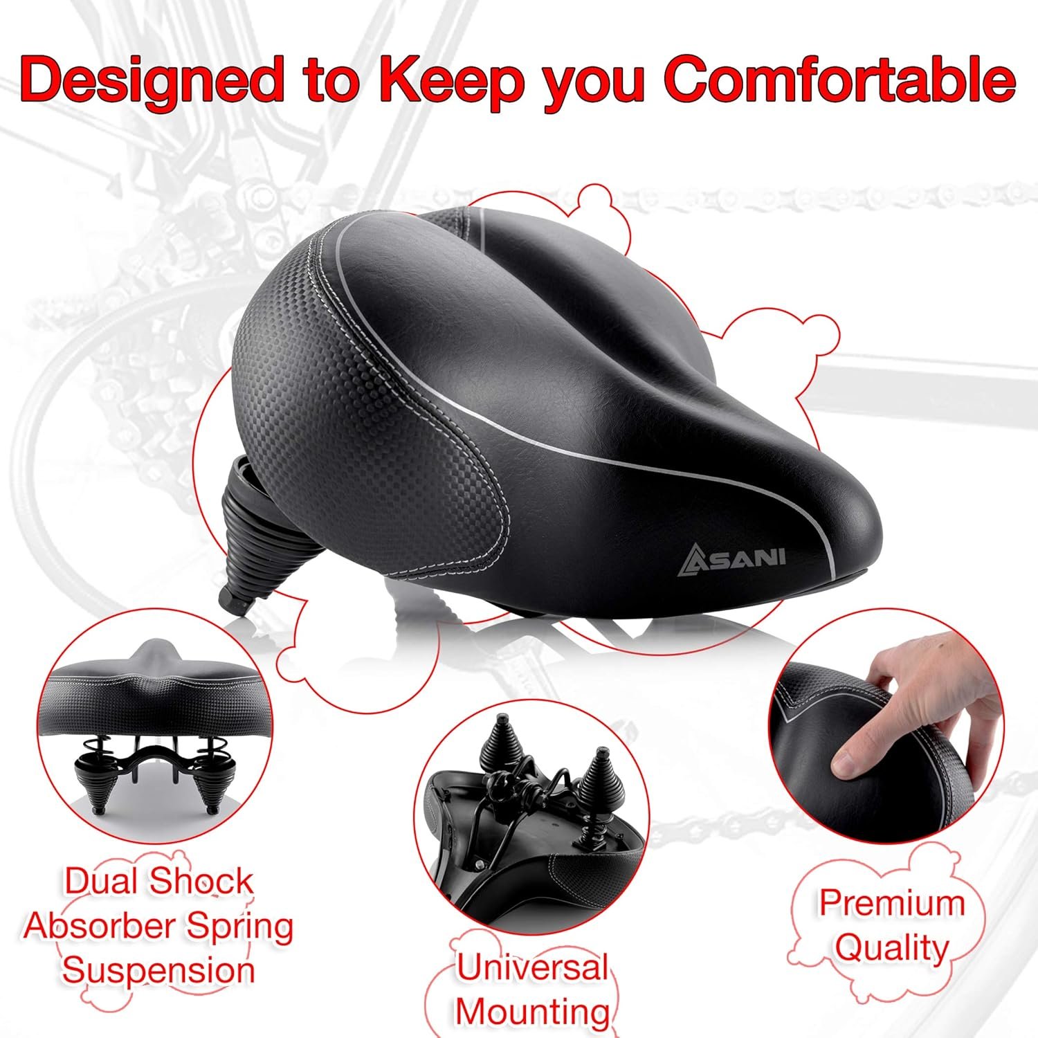 DESIGNED FOR EXTRA COMFORT: Unlike other bike saddles that are too thin, too narrow, and a pain over rough ground, our oversize replacement bicycle seat is extra wide, has more padding, and comes with dual-spring suspension for an impressively comfy ride for both men and women.