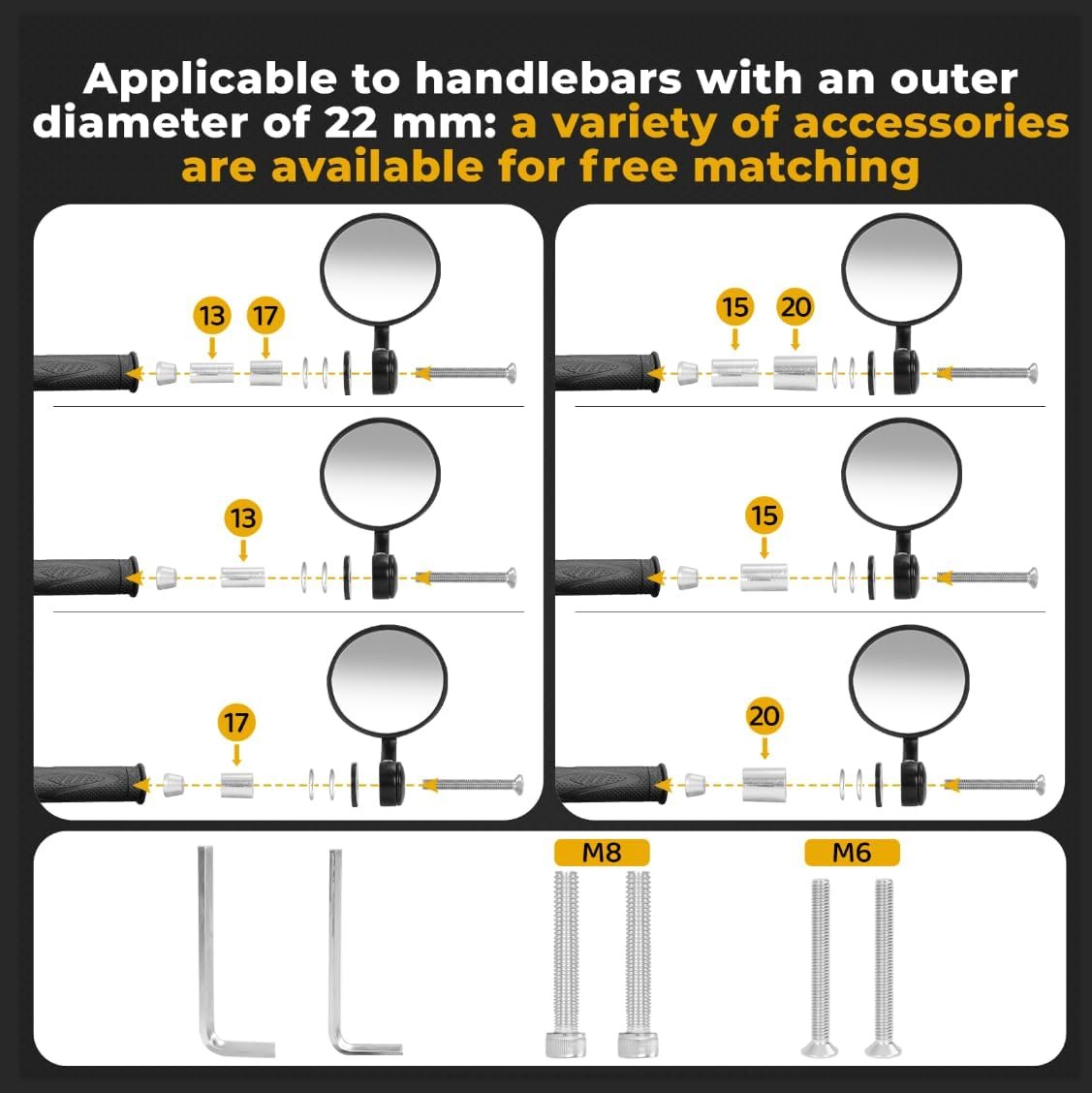 Side mirror motorcycle bar end mirrors for motorcycles fits handlebars with diameters ranging from 13mm to 19mm and comes with M8 and M6 bolts. Motorcycle mirrors is compatible with most motorcycle, street bikes, off-road vehicles, bicycles, and electric scooters.