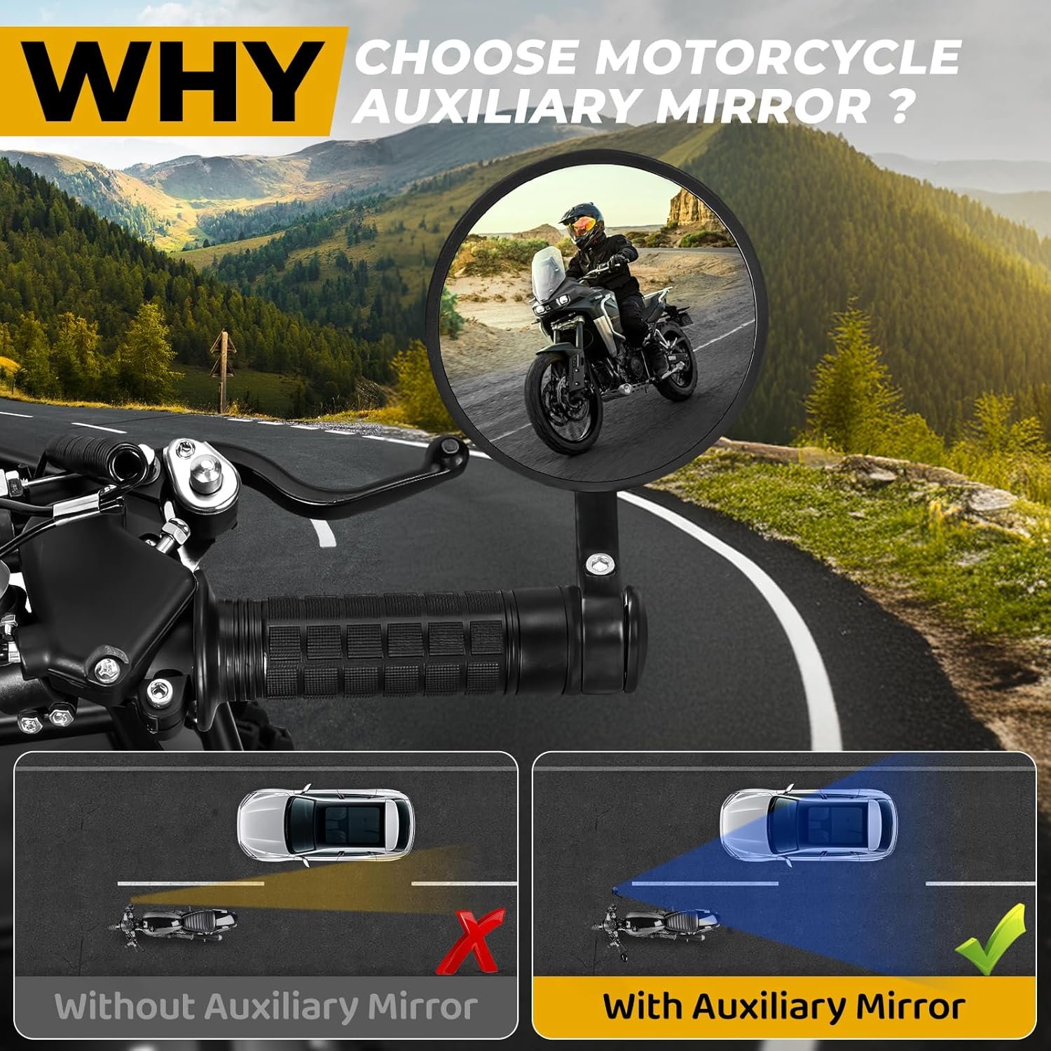 WIDER VISION:End of bar Motorcycle Mirrors Universal feature sturdy glass to provide you with a clearer and wider view of your driving. 360° rotation joint allows motorbike mirrors motorcycle side mirrors to be freely adjusted to the optimum viewing angle you want. Bar end mirrors motorcycle can prevent you from dizziness and see the things behind you from mirror more clearly. No more looking back while driving!Our Motorcycle Bar End motorcycle mirror for motorcycle has a larger and clearer field of view when illuminated.