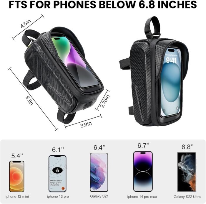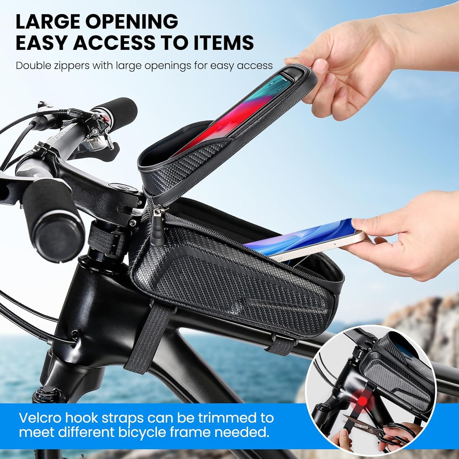 【𝐋𝐀𝐑𝐆𝐄 𝐂𝐀𝐏𝐀𝐂𝐈𝐓𝐘】: The bike bag has a very large capacity for storing not only your cell phone, but also other essentials such as keys, wallet, batteries, repair kit sunglasses or energy bars. It is also perfectly compatible with cell phones up to 6.5 inches, so you no longer have to compromise on what to carry while cycling.