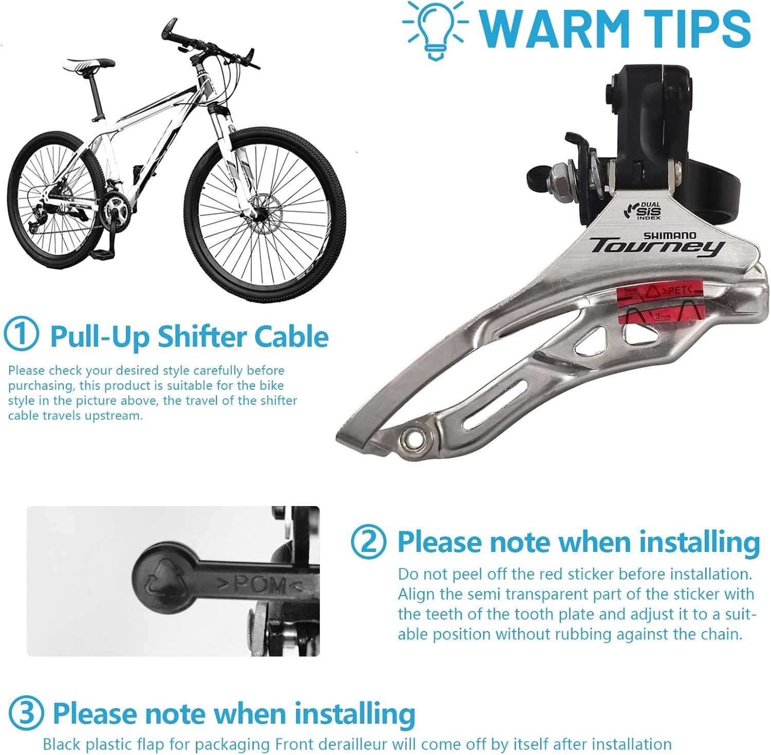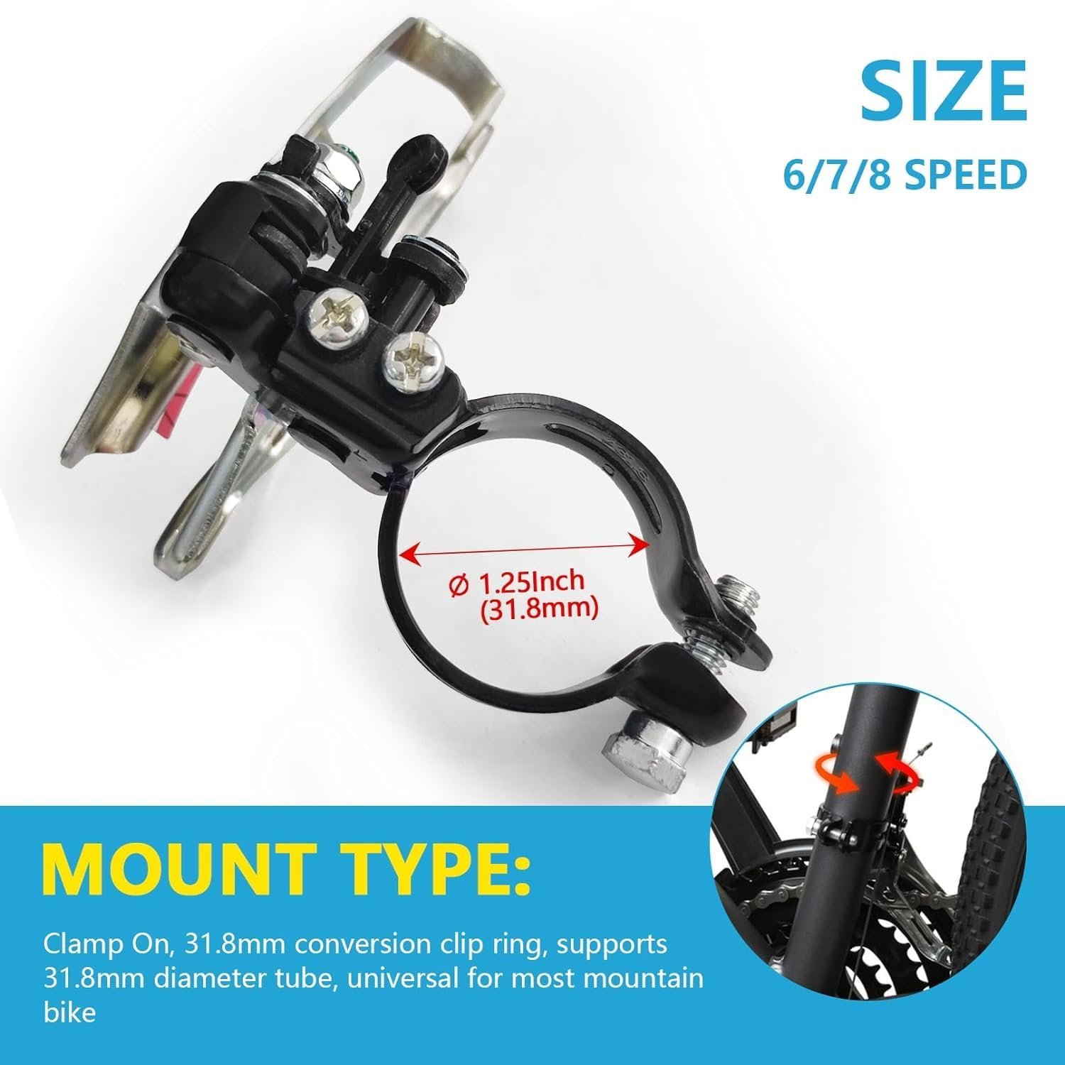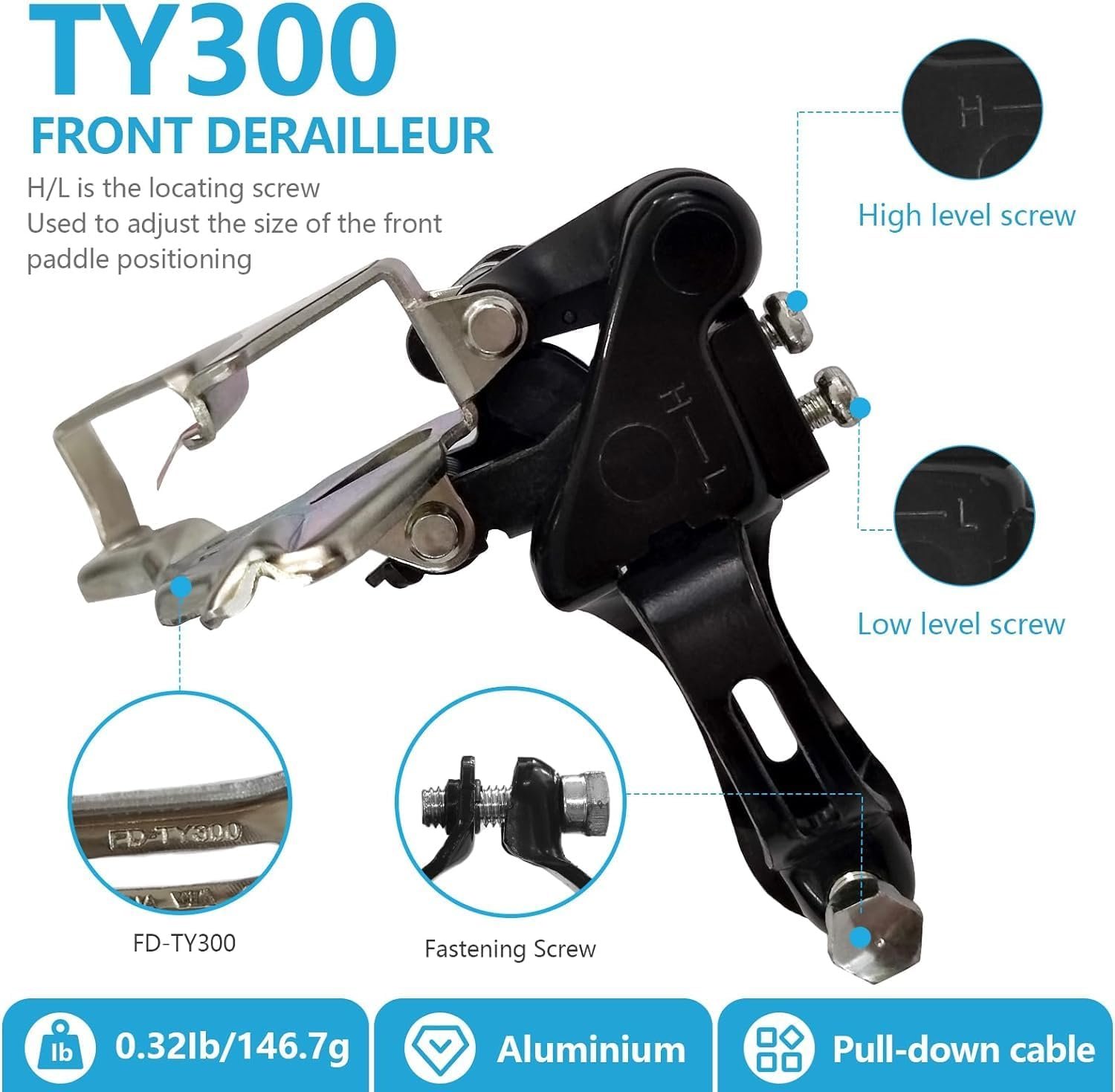 【Model】Front derailleur FD-TY300 Down swing 31.8mm, 3×6/7-speed. Made of high strength aluminum alloy material, strong and sturdy, Smooth variable speed performance.