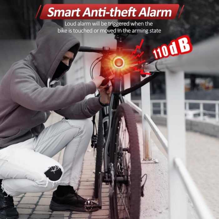 Bike Alarm with Remote, Bike Tail Light & Brake Light Auto ON/Off USB-C Rechargeable, 110dB Bicycle Alarm System Anti Theft Vibration Motion Sensor for Bike, Ebike, Scooter, IP65 Waterproof