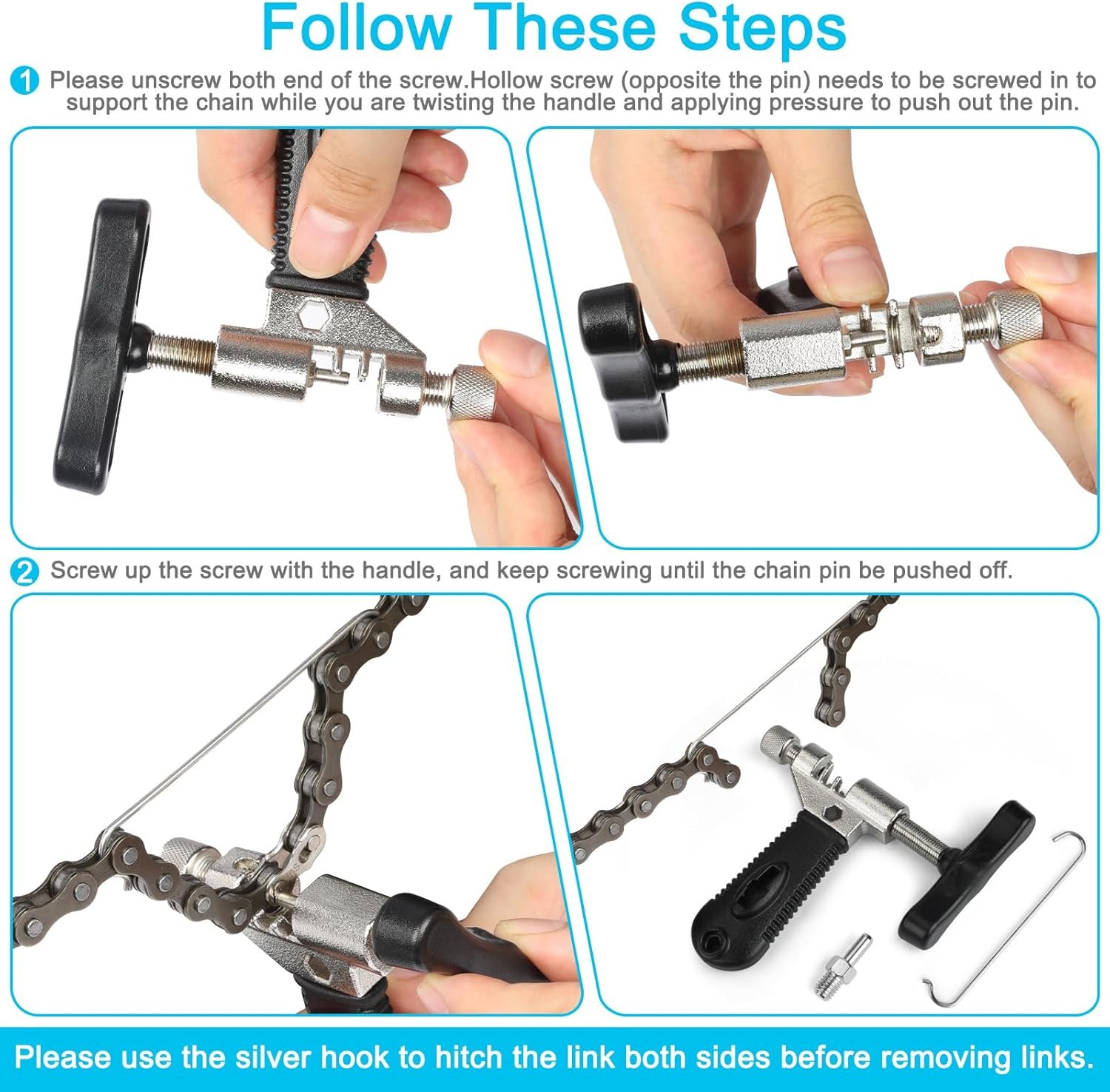 EASY TO USE: This practical bike chain splitter with chain hook allows you to remove and insert pint in the bike chain will securing it at the same time. This practical tool works great with 7, 8, 9, 10, 11 and single speed bicycle chains