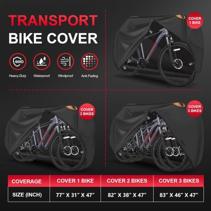 | Bike Cover for 2 Bikes Transportation | – Measures 82″ x 38″ x 47″ (L x W x H), this bicycle cover is designed to accommodate up to 2 bikes with full protection for outdoor journey, including: electric bike, road bike, mountain bike, hybrid bike, beach cruiser bike and more. Please arrange your bikes side by side or upside down for better coverage. (Note: please check the whole size of the 2-bike carefully!)