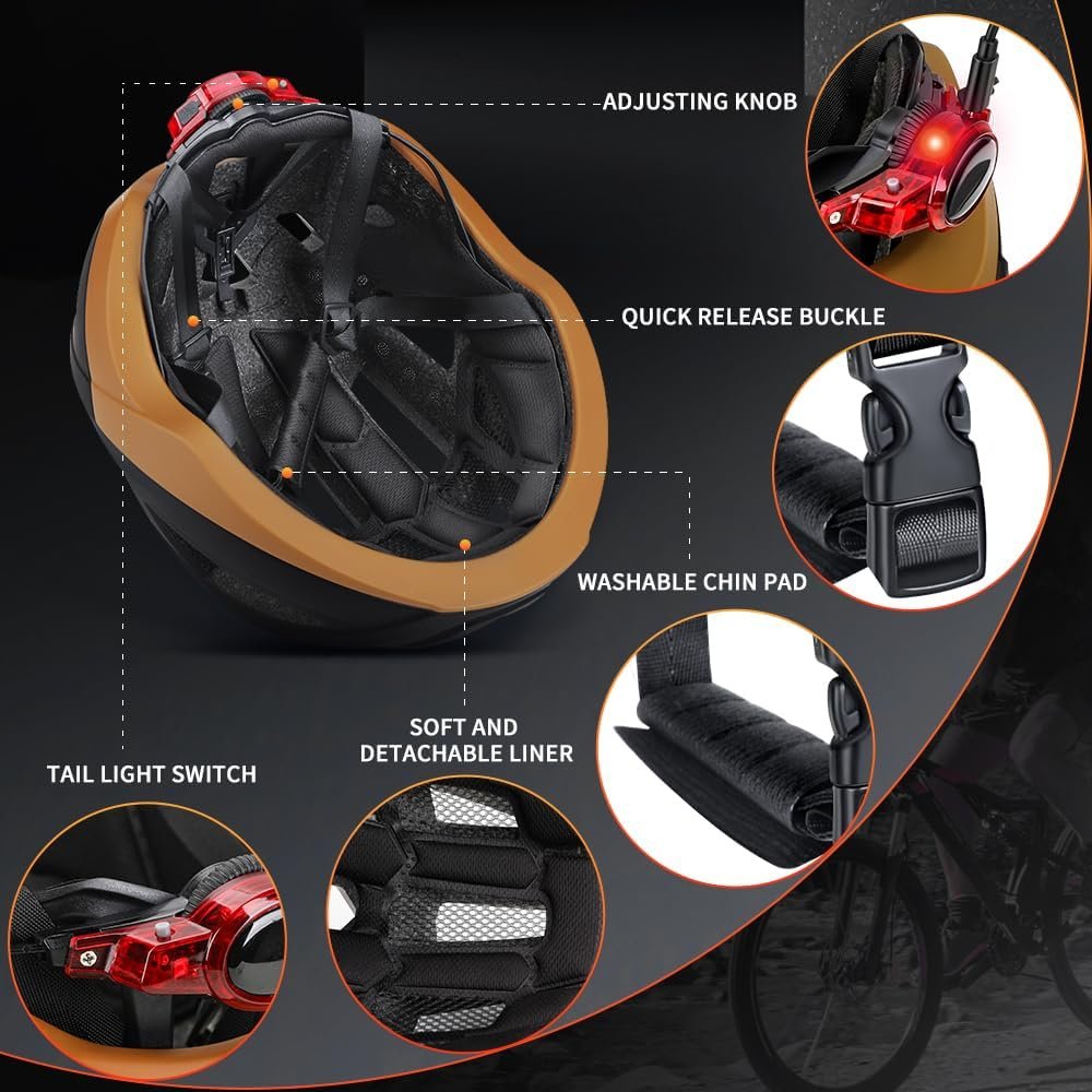 RECHARGEABLE HELMET LIGHT: Bicycle helmet with USB rechargeable tail light, 3 lighting modes – steady, fast flash and slow flash. The bike helmet rear light can be fully charged in just 1 hour and can last up to 7 hours of continuous use