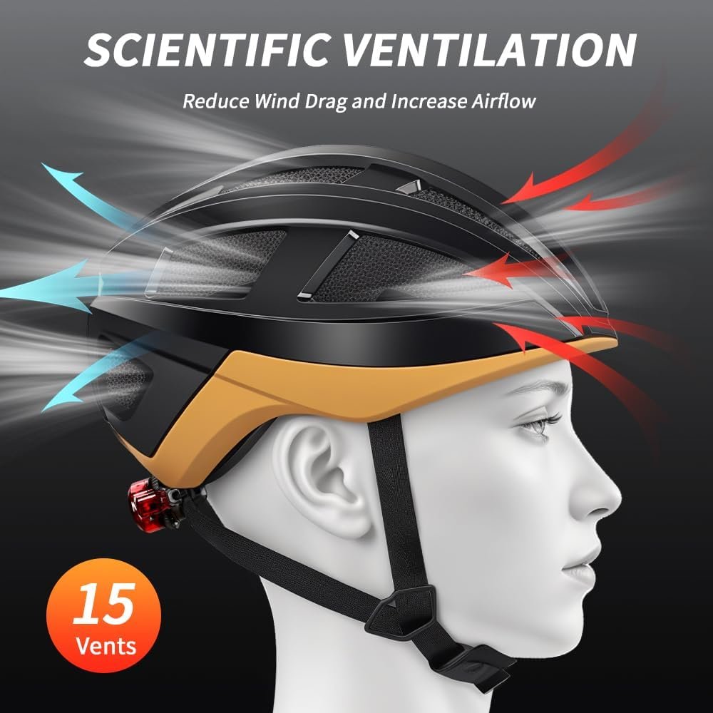The bike helmet features 15 air vents to keep you cool while cycling, enhancing airflow and reducing sweat on head.
