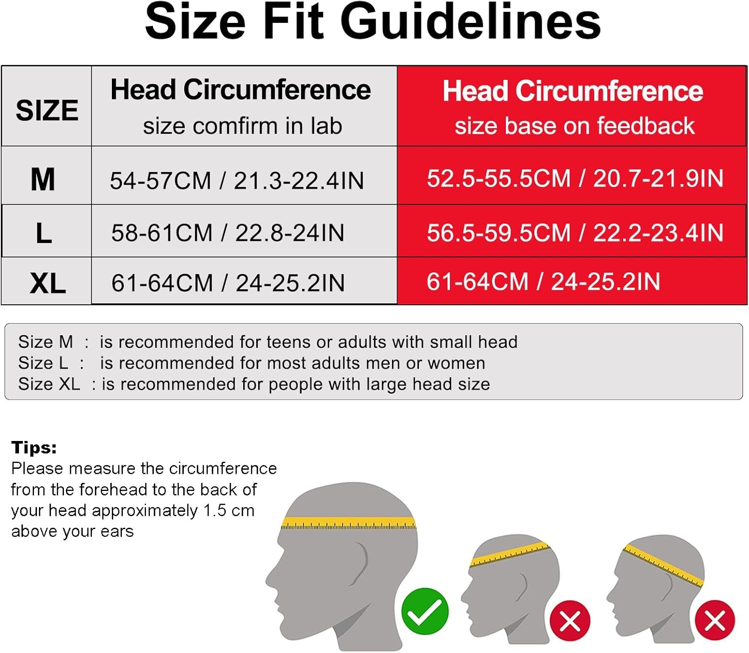 【Adjustable Bike Helmet】:This bicycle helmet is designed for adults or youth,teen; suggested head circumference:52.5-55.5cm(20.7-21.9 inches).To determine the correct helmet size,please wrap a measuring tape around youe head,the tape should rest 1.5cm bove your ears and remain level around the circumference of your head