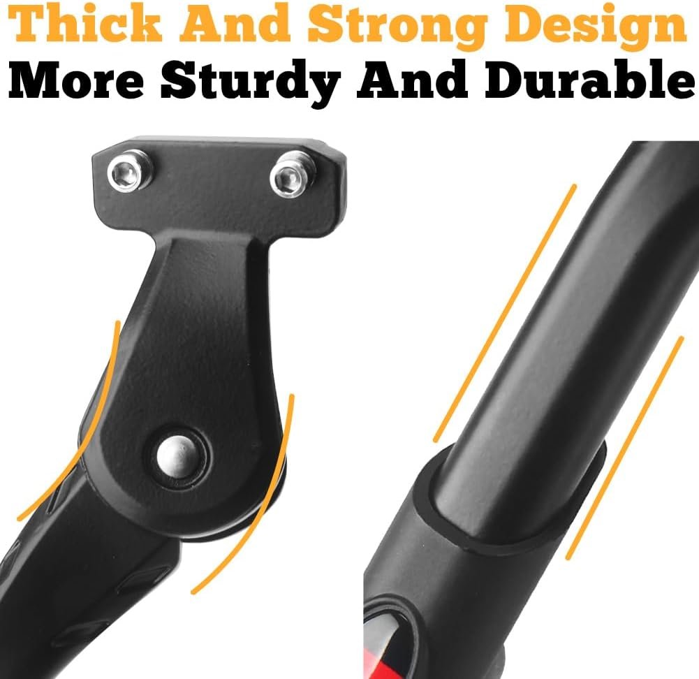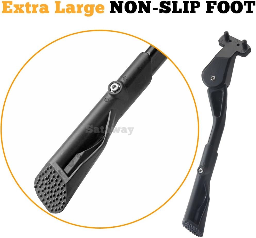This kickstand is coming with two M5(5mm) bolts for a quick installation on the bike.The kickstand has a wide and solid anti-slip foot at the end to make sure the bike won’t fall on uneven or slippery ground while you park it.