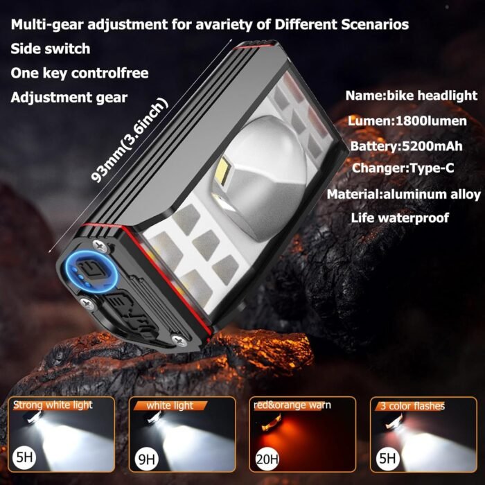 【Ultra-Strong Brightness】Using Multi-lamp Combination, 1800 Lumen brightness, 5200mAh,Super brightness and wide lighting, Provide a increased visibility safety night riding. Waterproof Life function allows you to ride with confidence even in rain or snow