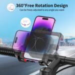 [Secure and Stable] Bike phone mount made of ABS plastic, light and strong, sturdy and shockproof. Free to rotate 360°, choose the best angle. Adjustable phone holder for motorcycle has non-slip silicone pads that prevents scratches and vibrations on your phone. The high-quality handlebar clamp with a built-in metal shaft securely fastens to the handlebar, keeping your phone steady on bumpy roads
